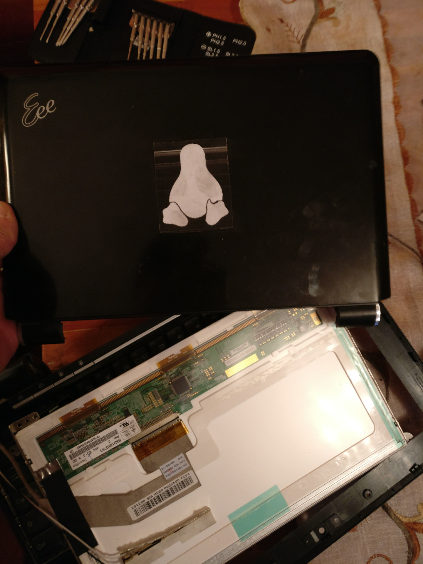 Először lazítsd meg a képernyő panelt belül, hogy mögé tudj nézni!!! Kapcsold be a gépet és nézd meg, hogy a képernyő hátul ad e fényt. Sok panelt ragasztott fóliával hátul is lefednek, így nem jön ki fény. Ekkor vagy expert vagy és raksz oda egy ledet, vagy óvatosan leszeded a fóliát, vagy hagyod a fenébe a projecktet. (én ezt tenném ekkor)