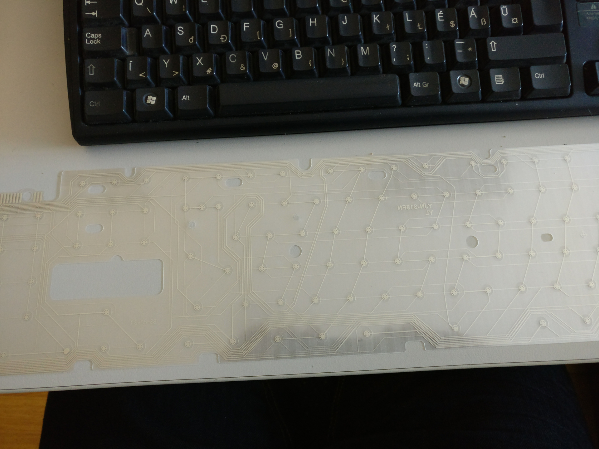 És ekkor jön a billentyűzet. 🙂 Abban van a billentyűk alatt egy áramkör rajzolatú átlátszó fólia. Szedd szét, vágj egy négyzet alakú fóliát, ragaszd mögé, és kész!