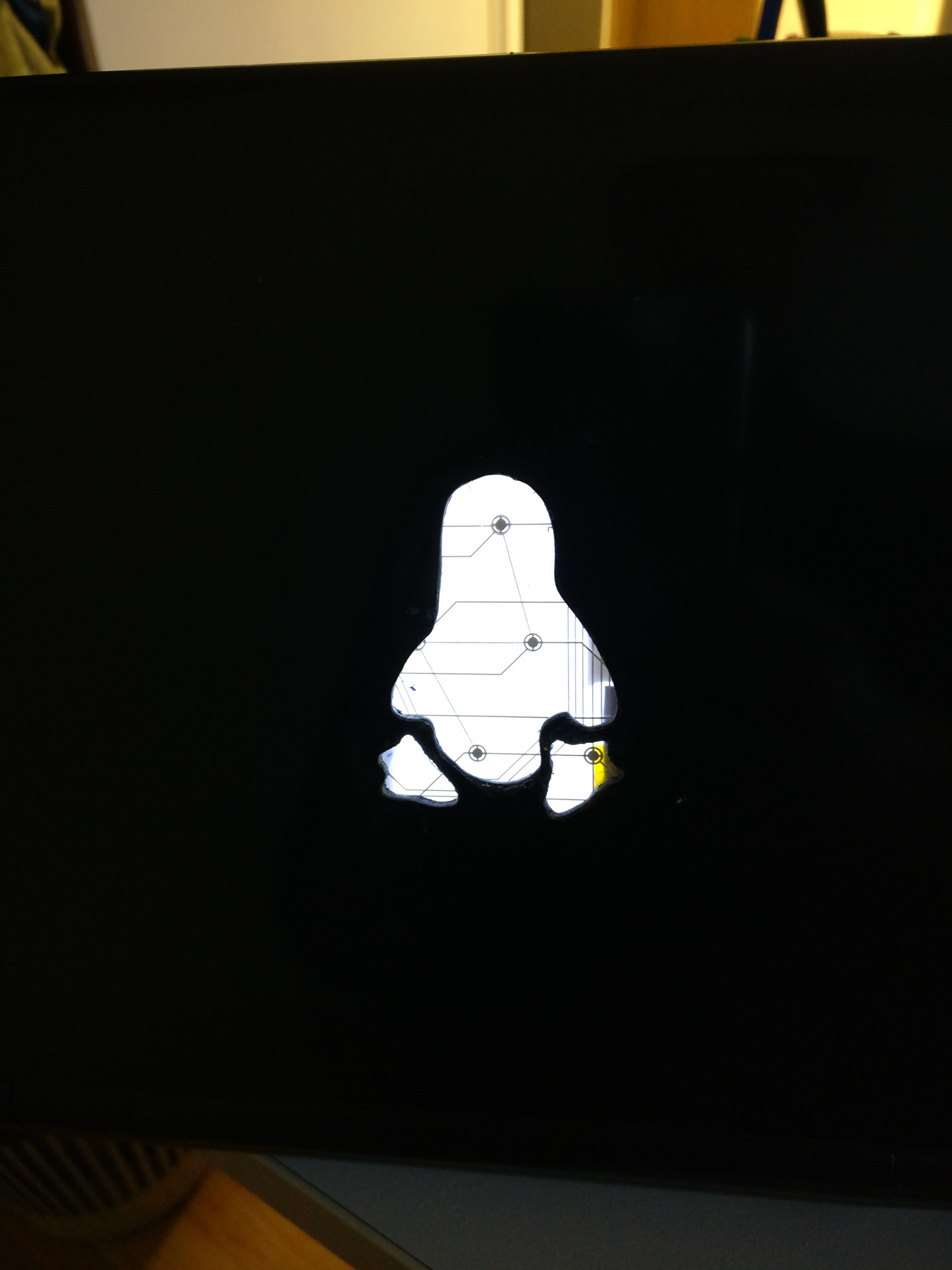 Marad tehát az, hogy valamit mögé teszel, bevállalod, hogy a minta bemélyed a fedlapba, és azon agyalsz, hogy ezt hogyan dobd fel vállalhatóra! Ezt tettem én is, aztán jött az ötlet: legyen egy világító, tux alakú áramkör az egész. (ha akarod oldd meg nyugodtan tejfehér sima műanyag lemezkével, csak figyelj, hogy vékony legyen, hogy a képernyő panelt vissza tudd azért tenni a helyére) Oké, de honnan szerzek átlátszó áramkört?