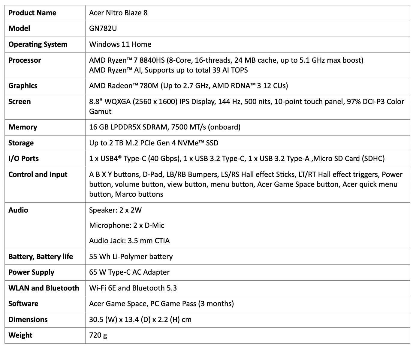 A méretes Nitro Blaze 11 levehető vezérlőket is tartalmaz, ehhez pedig egy erős beépített állvány is jár, de megtaláljuk az elülső kamerát is a streaminghez. A csatlakozók szerepét az USB 4 (Type-C), az USB 3.2 (Type-C) tölti be, míg a hálozatükat Wi-Fi 6E és Bluetooth 5.3 segítségével érjük el.