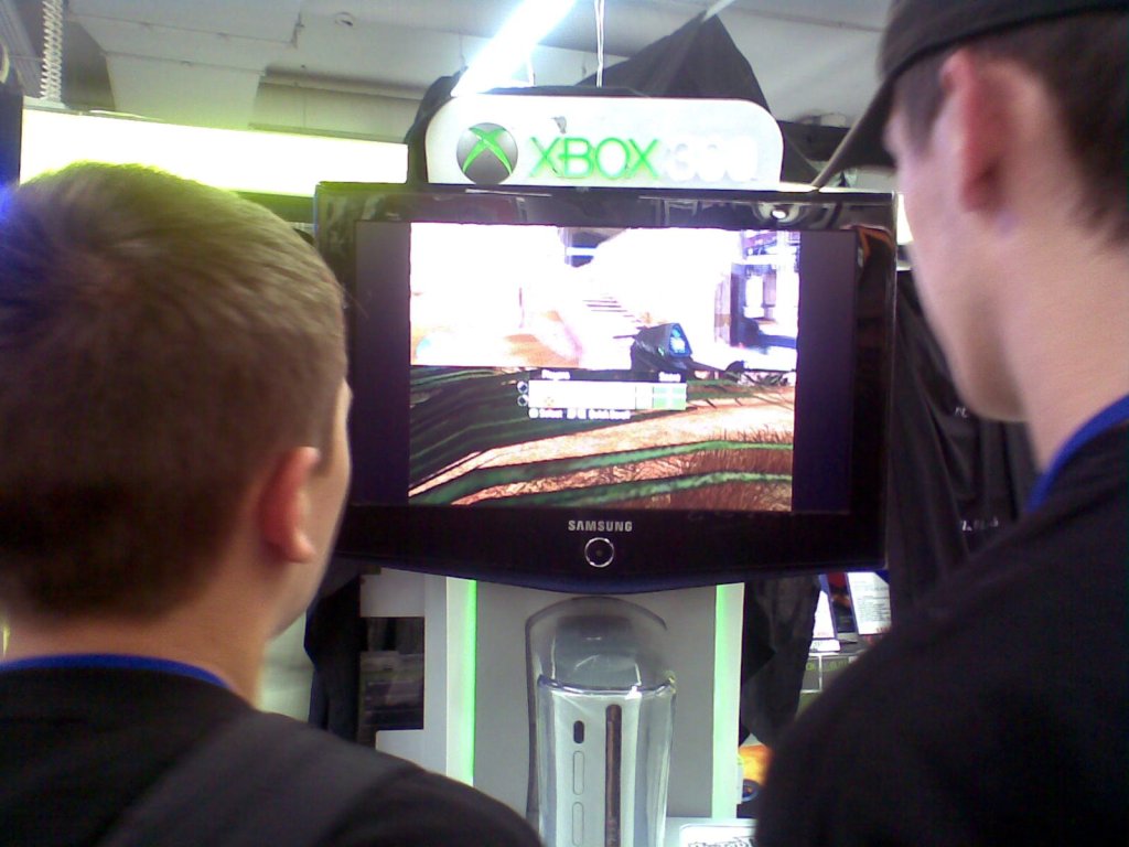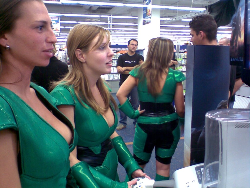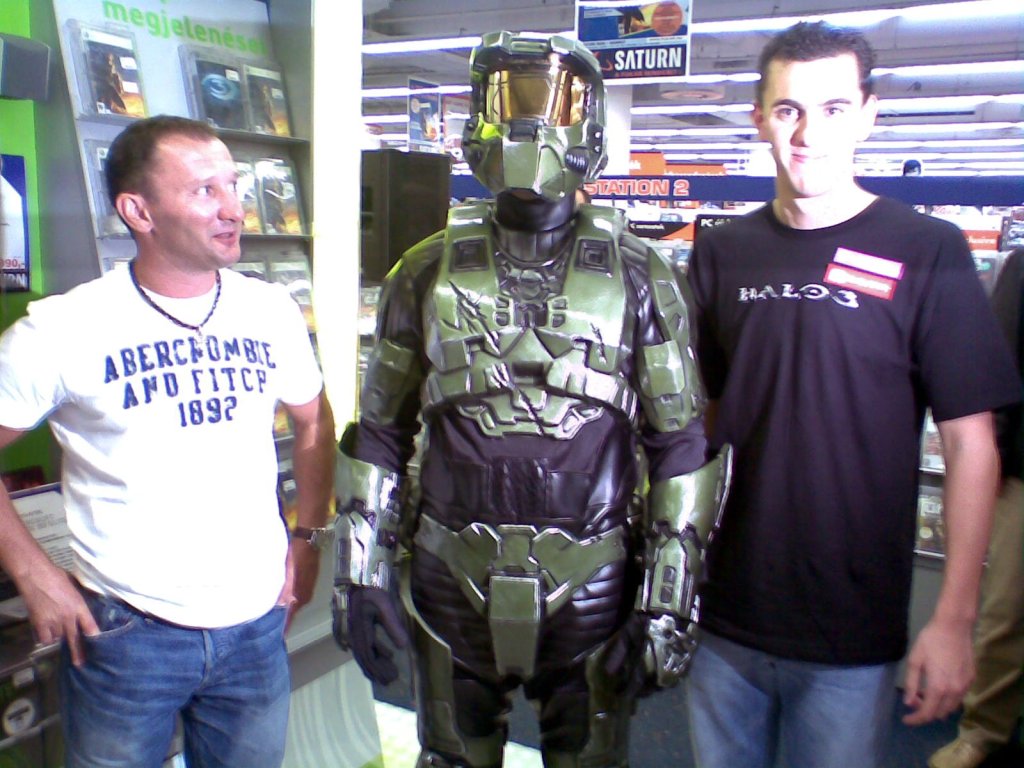 Az óriástévék mellett egy visszaszámlálón ketyegett a digitális óra, és egyre nagyobb tömeg várta, hogy éjfél legyen, amikor is lehull a lepel a polcokról és le lehet kapkodni az első adag Halo 3-at. Az igazi gyönyör azonban akkor érte a közönséget, amikor pontban éjfélkor megjelent maga a nagy Master Chief, hogy néhány bombanő társaságában végigfeszítsen a tapsviharban kitörő rajongókon és meg se álljon az első szabad konzolig. Ott akkor kezébe vette az irányítót és megmutatta, mi is az amit játéknak hívunk. Meglepően sok gyereket hozott el még meglepőbben sok apuka, de nem is csoda, ki ne akarna egy fotót magával a Nagy Harcossal? Próbáltunk kihúzni néhány szót a hallgatag Hősből, de sikertelenül, így maradt csak egy feszítős fotó.