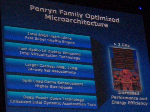 Az eddigiekből leszűrve azt is mondhatnánk, hogy miniatürizált Core 2-es processzorokról van szó, azonban a Penryn még ezen felül is tartogat újításokat. Az előző generációt tekintve mintegy másfélszeresére nőtt a másodlagos gyorsítótár maximális mérete, így például a kétmagos processzorok esetében már 6MB-ról beszélhetünk a korábbi négy helyett. A processzorba integrált gyorsítótár ugyebár arra hivatott, hogy a viszonylag lassú rendszermemória-elérést helyettesítse, a közvetlenül végrehajtás előtt álló utasítások számára. 6MB már igencsak megkönnyíti a központi egység dolgát, és minden bizonnyal látványos teljesítményt eredményez, nem is beszélve a négymagos változatok kétszer 6MB-os gyorsítótáráról. Az új processzorok sínsebessége immár eléri a 400MHz-et a korábbi 333Mhz-hez képest. Az utasításkészlet is frissült, új utasítások kaptak helyet az SSE4.1-esre keresztelt új készletben, ezek elsősorban a grafikus alkalmazások gyorsítása végett kerültek az új lapokba.