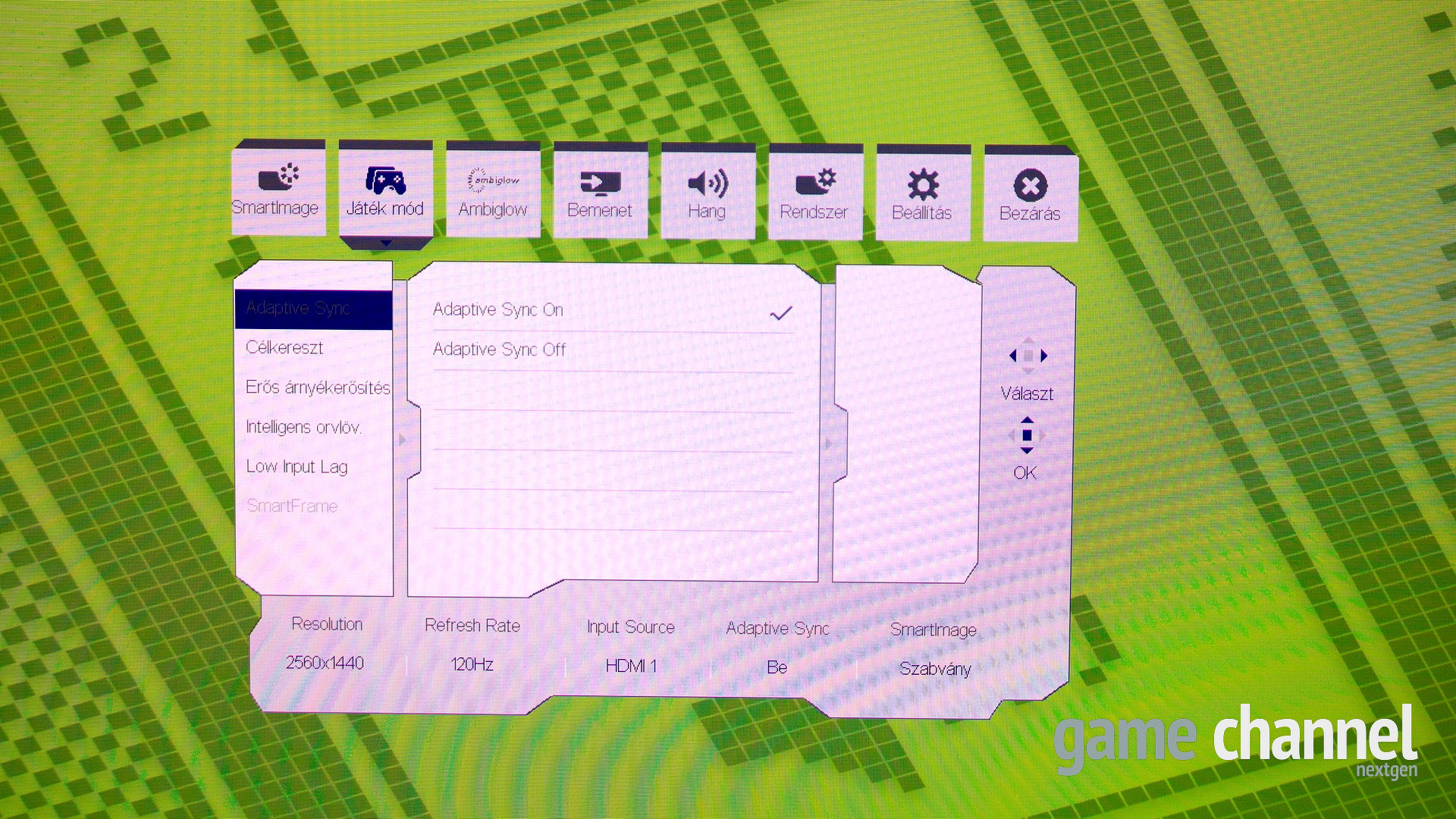 A tápellátás LEDje nincs túlbonyolítva, egyetlen szín megjelenítésére képes, ha aktív az eszköz, akkor fehéren világít, ha készenléti állapotban van, akkor fehéren villog. A beépített OSD menü magyar nyelven is tud, és gyakorlatilag minden beállításra van lehetőség, amire a monitor funkciói képesek. Itt lehet állítani a hátlapba szerelt, három oldalas Ambiglow fényeket is, ami természetesen minden gamer legnagyobb kedvence lesz.