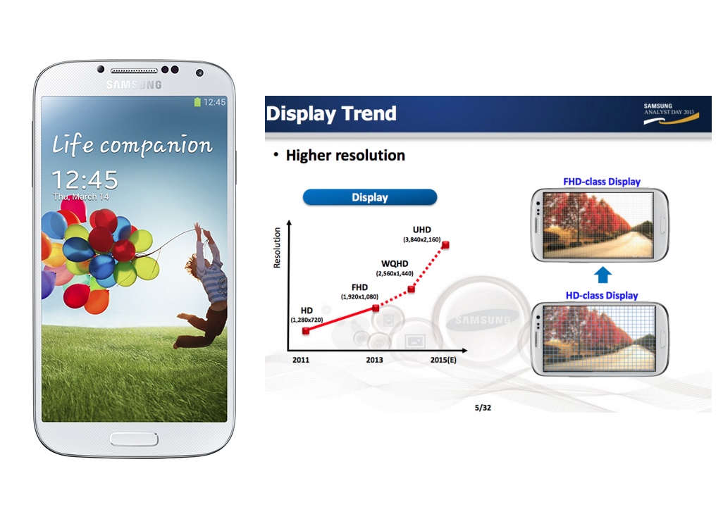Jelenleg a Full HD megoldások jelentik az általános megoldásokat a felső szegmensben, de mivel a telefonok minden alkatrésze folyamatosan fejlődik, ezért a kijelzők sem maradhatnak érintetlenül. További információk szerint a 64-bites processzorok megjelenése is 2014-ben következik majd be, vélhetően a Galaxy S 5 készülék bemutatásakor.