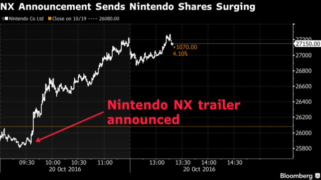 Elképesztő dolgok történtek az elmúlt órákban a Nintendo háza táján, akik a Nintendo Switch bejelentésével végre újra visszaülhettek a trónra, és mindez természetesen részvényeiken, illetve a cég értékén is megmutatkozott. Sőt mi több, a Bloomberg jelentése még bőven a konzol bemutatásának előtti időszakra nyúlik vissza, az említett lap szerint ugyanis amint a japán gyártó bejelentette az akkor még Nintendo NX néven emlegetett szerkezet leleplezésének hírét, rögtön az egekbe szöktek a részvényáraik, ezáltal a cég piaci értéke alig perceken belül 1 milliárd dollárral növekedett.
