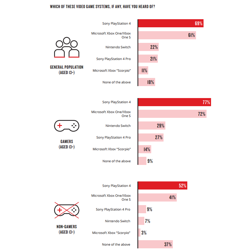 A történethez természetesen hozzátartozik, hogy az amerikai gamerek egyelőre még nem is nagyon hallottak a Project Scorpio-ról, így az alábbi statisztikák megmutatják, hogy míg a PS4-et a gamerek 77 százaléka ismeri, addig a Skorpióról még csak 14 százalékuk hallott.