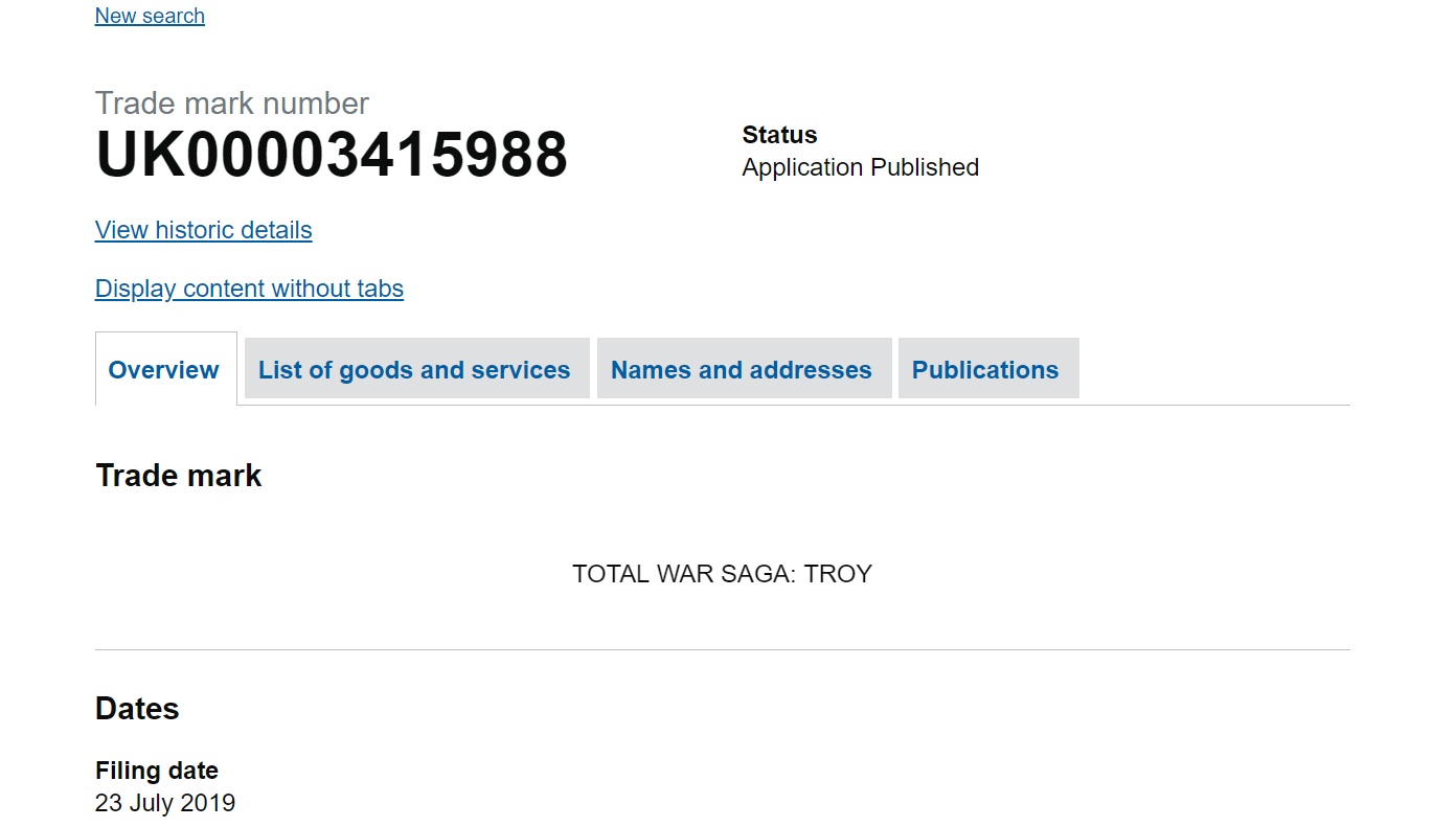 Újabb konkrét történelmi korszakot dolgozhat fel a Total War Saga, avagy a Total War-sorozat mellékága, lévén a The Creative Assembly a minap új névjegyet regisztrált, mely pontosan erről szól. A Total War Saga: Troy címet leszámítva azonban semmiféle konkrét részlet nem látott még napvilágot a játékról, és ez alapján is csak arra tudunk asszociálni egyelőre, hogy a trójai háborút, illetve annak időszakát állítja majd a középpontba az egész.