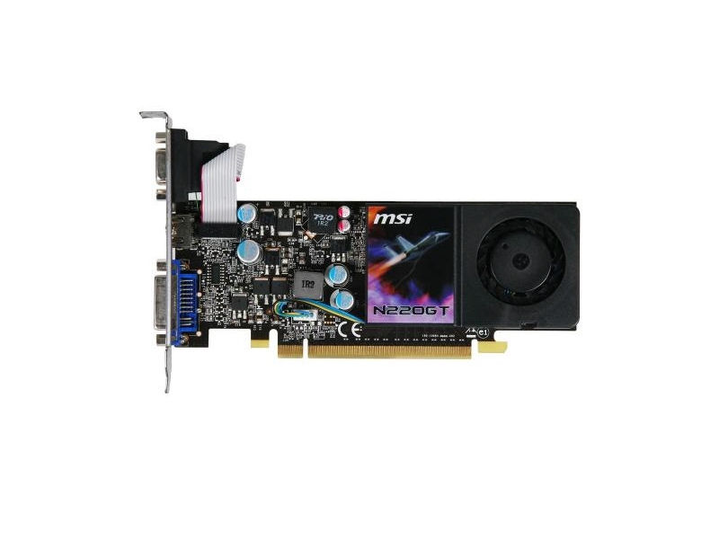 A gyorsító hűtéséről egy kisméretű, egyetlen kártyahelyet elfoglaló aktív hűtőrendszer gondoskodik. Az MSI N220GT-MD1GL/D3 grafikus feldolgozója 48 darab shader processzorral van felvértezve, az 1024MB GDDR3 videomemóriát pedig egy 128bit-es interfészen keresztül érheti el. A GPU sebességét 625MHz-re, míg a CUDA magokét 1360MHz-re hangolták be a mérnökök, a memóriarendszer pedig az 1580MHz-es frekvencián üzemel. A különféle kijelzőknek a hátlapi panelen kialakított D-Sub VGA, DVI és HDMI kimenet biztosít csatlakozási lehetőséget.