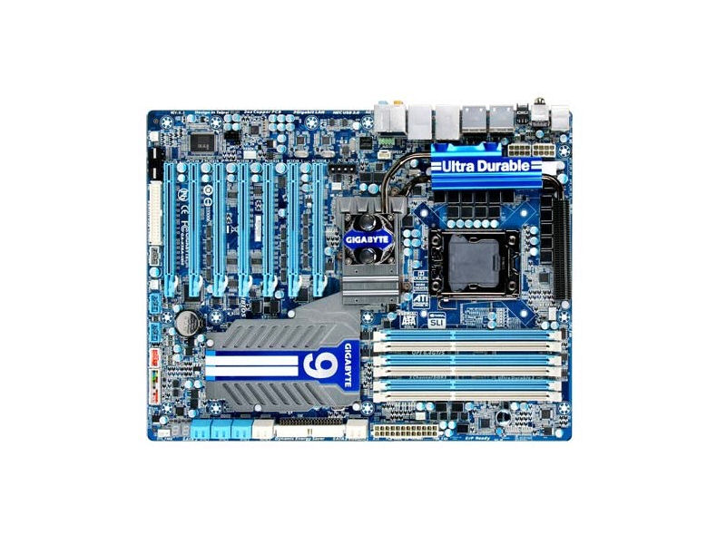 A Gigabyte GA-X58A-UD9 a grafikus gyorsítók részére nem kevesebb, mint hét darab 16X-os PCI Express foglalattal van felvértezve, és az integrált nVidia NF2000-es chipeknek köszönhetően könnyedén kiépíthető akár a négyutas ATI CrossFireX vagy nVidia SLI grafikus konfiguráció is (teljes 16X-os sávszélesség mellett). Az előbb említett hét darab 16X-os PCI Express slot miatt további bővítőkártya beépítése sajnos nem lehetséges. A rendszermemóriát hat darab DDR3-as aljzatba lehet telepíteni, amik maximálisan 24GB RAM-ot képesek kezelni, akár a túlhajtott 2200MHz-es frekvencián is. A különféle meghajtóknak egy floppy, egy PATA (Ultra DMA 33/66/100/133), nyolc darab SATA II, valamint két darab SATA 3.0 port biztosít csatlakozási lehetőséget.