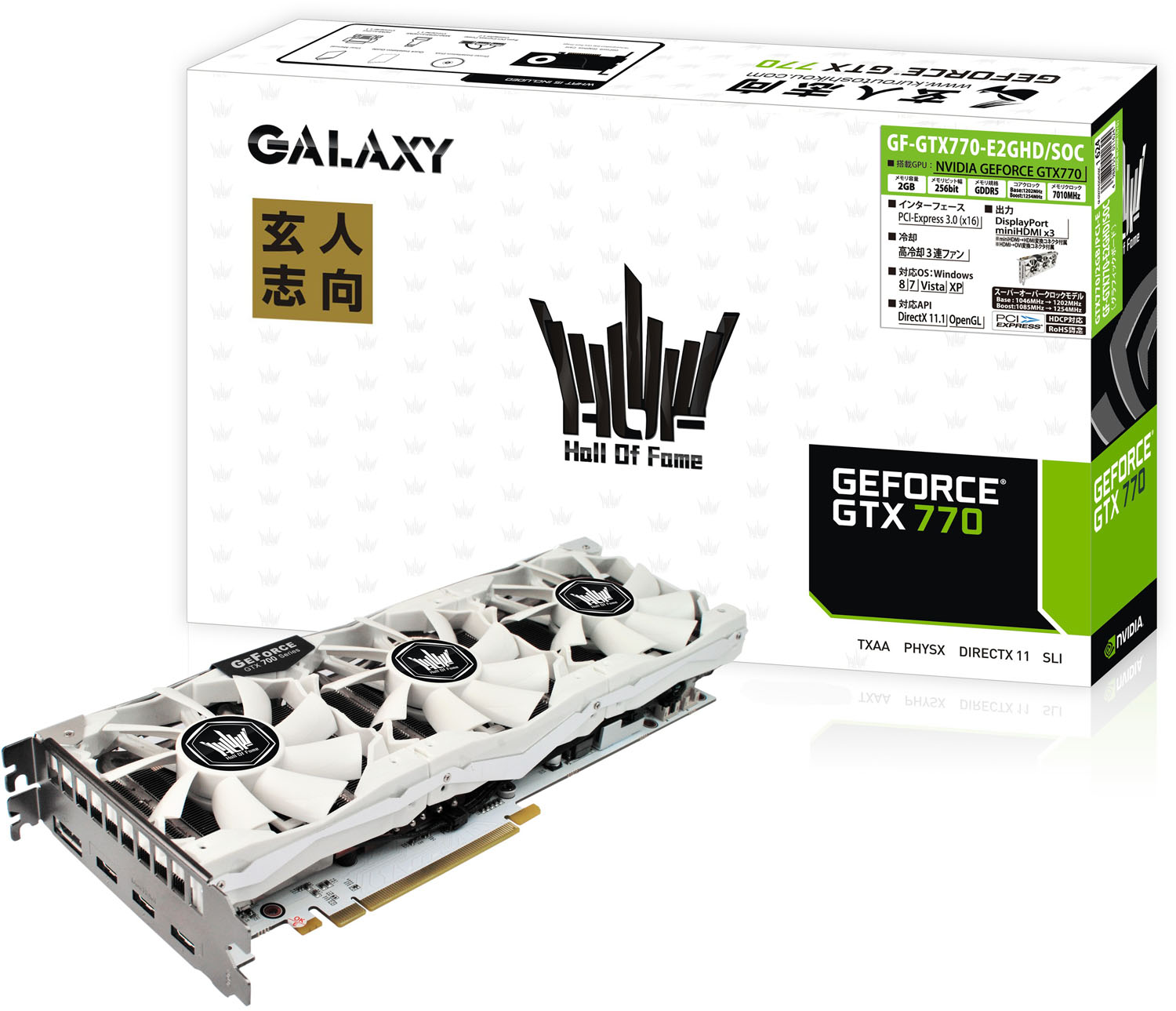 A GeForce GTX 770 HOF verzió a gyári 1046/1085 MHz-es érték helyett 1202 MHz/1254 MHz-en zakatol. A kiváló teljesítmény elérésében nagy segítség még a 2 GB GDDR5 memória és a 256 bites interfész. A hűtésről egy három-ventilátoros rendszer gondoskodik, mely kellő képen képes lehűteni a kártyát.