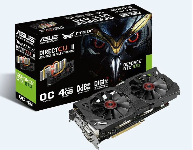 Az ASUS GTX 970 Strix gyárilag felturbózott órajellel érkezik, a 4GB GDDR5-ös memória pedig természetesen ennél a modellnél sem került megváltoztatásra. A megfelelő hőmérsékletről a gyártó DirectCU II-es megoldása gondoskodik majd, ráadásul gyenge használat mellett 0dB zajjal is üzemelhet majd a kártya.