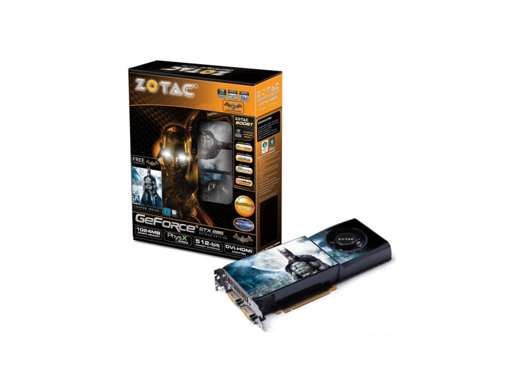 Az új gyorsítókártya hűtéséről, a dupla kártyahelyet elfoglaló referencia hűtőrendszer gondoskodik, amit persze a játékot idéző mintázattal díszítettek fel, de a dobozban a gyártó mellékel egy kupont is, aminek a segítségével a felhasználó letöltheti a Batman: Arkham Asylum teljes értékű változatát. A Zotac GeForce GTX 285 Batman Edition órajelei hűen követik az nVidia előírását, vagyis a grafikus feldolgozó teljesítményét 648MHz-re, a 240 darab stream processzor sebességét pedig 1476MHz-re hangolták be. Az 1024MB RAM-al ellátott 512bit-es GDDR3 memóriarendszer az 1242MHz-es frekvencián üzemel (2484MHz-es effektív teljesítmény). A videokártya hátulján két DVI és egy TV kimenet kapott helyet, de a nyomtatott áramkörről persze nem hiányzik a már jól ismert nVidia SLI csatolófelület sem, így lehetőség van akár a többkártyás SLI konfiguráció kiépítésére is. Az újdonság kínálatában természetesen továbbra is megtalálható a teljes körű DirectX 10 támogatás, valamint az nVidia népszerű PhysX, CUDA, és PureVideo HD technológiája. A Zotac GeForce GTX 285 Batman Edition várható megjelenési idejéről és áráról a gyártó egyelőre nem közölt részleteket, annyit mindenesetre elárultak, hogy a kártya mindössze 900 darabos limitált példányszámban lesz elérhető.