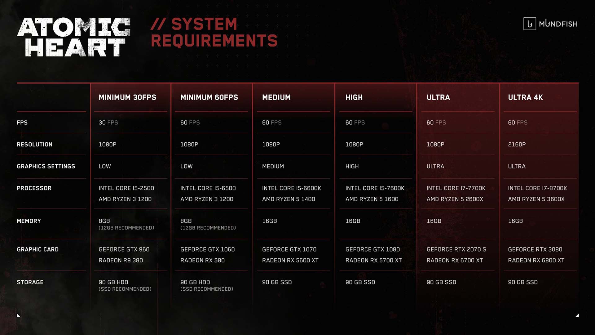 Atomic Heart 4K gépigény (60fps, 4K, ultra settings):