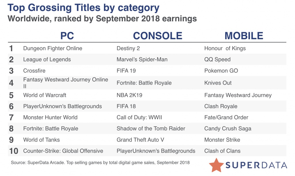 Mutatjuk is inkább a SuperData eredményeit, akik nemcsak a konzolos, hanem a PC-s és a mobilos játékok digitális eladásait is listázták szeptemberre.