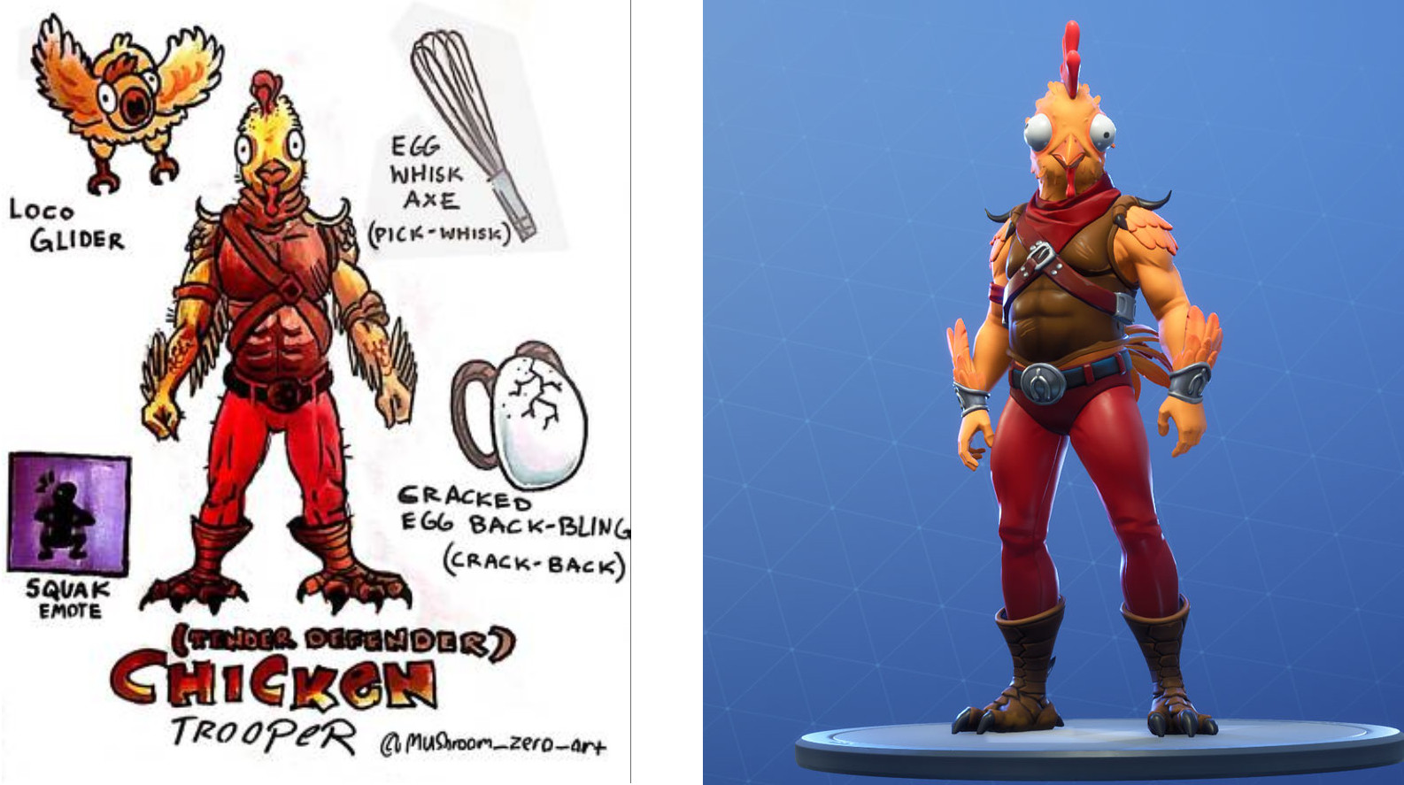 Az éjszaka folyamán bekerült a Fortnite játékbeli boltjába egy vadonatúj skin, a Tender Defender, ami első ránézésre csak egy átlagos kinézetnek tűnik, azonban van hozzá egy nagyon aranyos kis sztori is. Maga a skin egy csirkét ábrázol, viszont az Epic Games egy 8 éves kisfiú rajzát használta fel a tervezéskor, no persze nem arról van szó, hogy a stúdió kifogyott az ötletekből, és hirtelen le kellett nyúlni valahonnan egy ötletet.