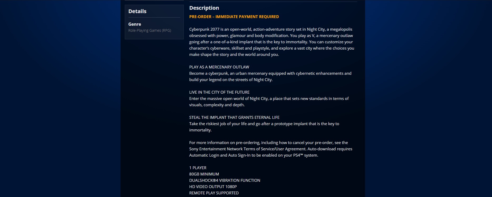 Bár viszonylag még messze van a várva várt Cyberpunk 2077 megjelenése, azonban úgy fest, máris megtudtuk, mennyire kell takarítanunk majd a merevlemezünkön, hogy elférjen a CD Projekt Red műve. A PlayStation Store felületén ugyanis fel lett tüntetve, hogy a játék 80 GB-os fájlmérettel fog terpeszkedni a tárhelyünkön, amihez még hozzátartozik, hogy kiemelik, hogy "minimum" ennyi kell, így lehet rá készülni, hogy akár ez a szám a 90, hovatovább a 100 GB felé fog majd konvergálni.