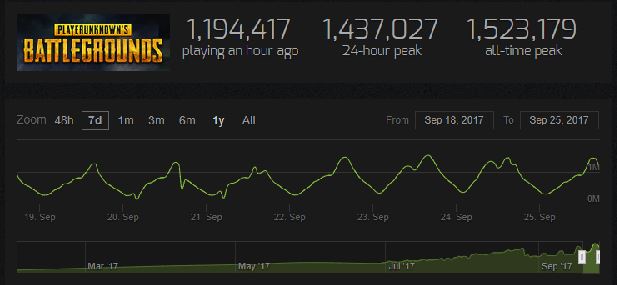 A Steam Charts ugyanis nyilvánosságra hozott egy olyan grafikont, amiből kiderült, hogy még a hétvégén voltak olyan órák, amikor a PlayerUnknown’s Battlegrounds szerverein egyszerre több mint 1,5 millió játékos volt jelen, ami példátlannak tekinthető a Steam történetében.