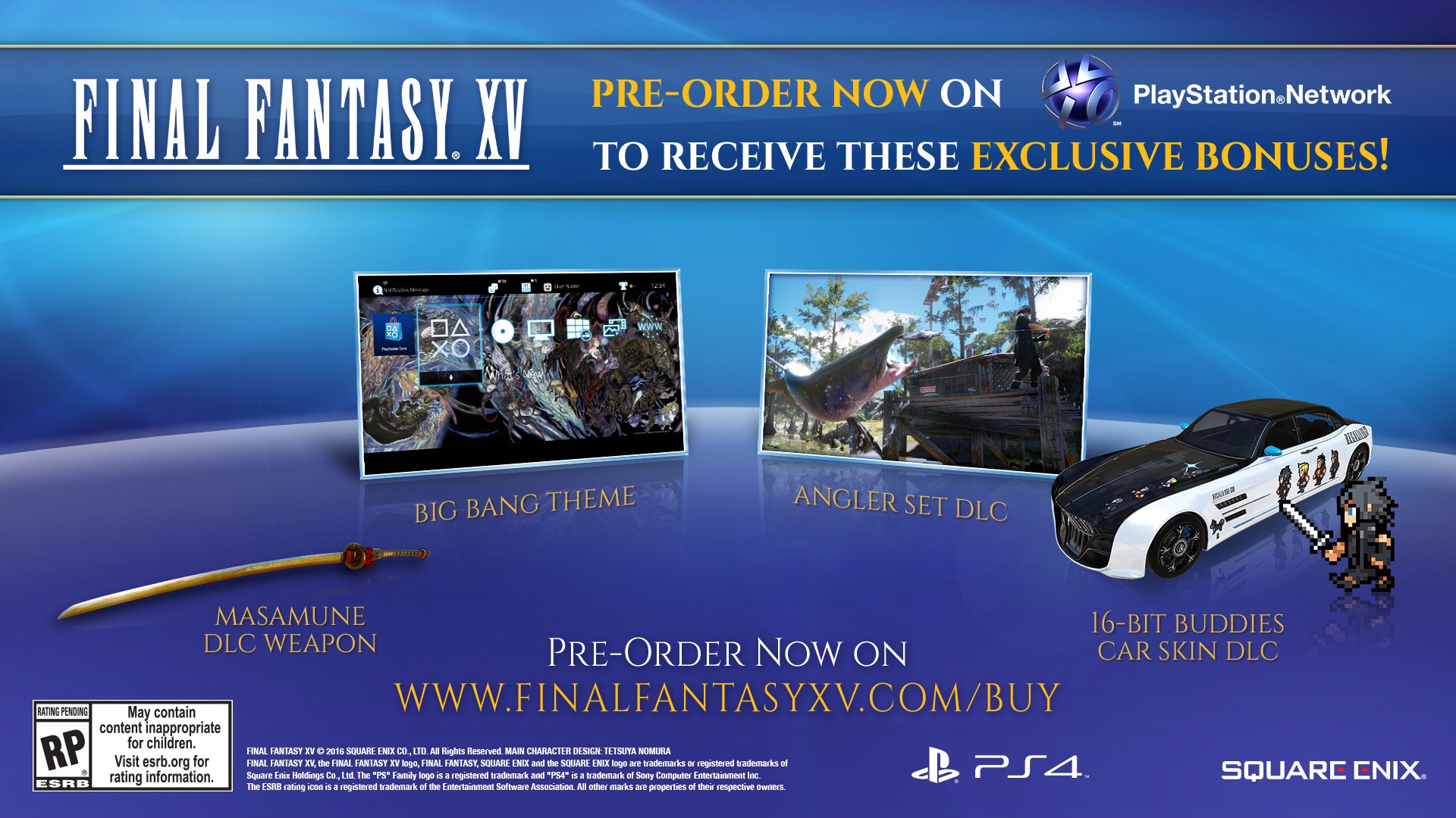 Habár a Final Fantasy XV megjelenése egy kicsit még odébb van, ellenben a Square Enix már most úgy határozott, hogy bejelentik a rajongóknak, hogy pontosan milyen előrendelői extrákra is számíthatnak a PSN-es vagy az Xbox Live-os elővásárlás esetén. Ennek megfelelően kiderült, hogy aki a PlayStation Network-ről rendeli elő magának a játékot, az hozzájuthat többek között egy Masamune kardhoz, 16 bites autófestésekhez, egy Big Bang témához, valamint az Angler Set DLC-hez.