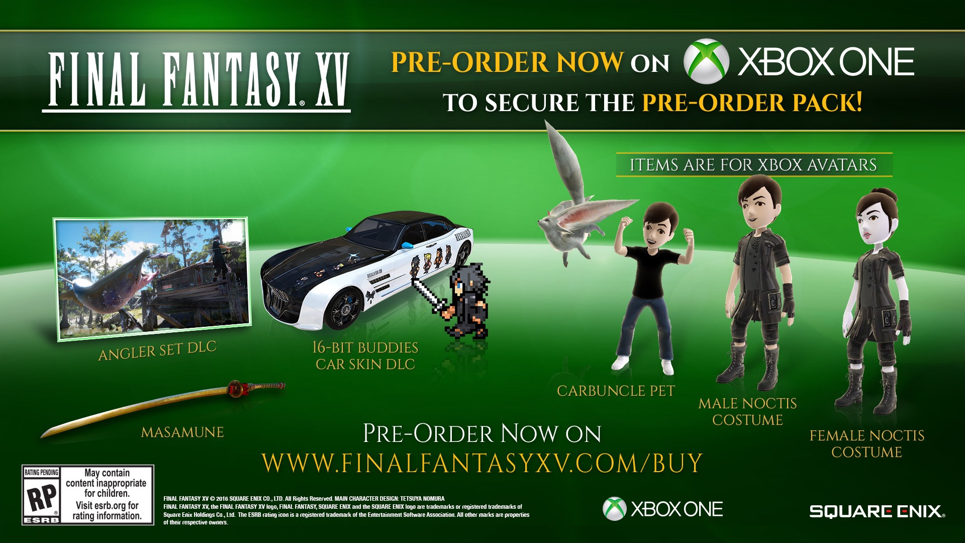 Ha az Xbox Live-os előrendelést választjuk, abban az esetben az Angler Set letölthető tartalom, a Masamune kard és az autófestések mellett exkluzív Xbox Avataros kiegészítőket kaphatunk. Nézzétek meg a képeket a pontosabb a pontosabb részletekért.