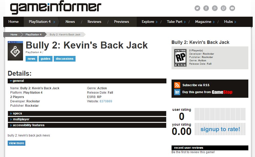 Miután éjszaka majdnem fejre állt az egész világháló emiatt, a Game Informer egy Twitter-üzenetben jelezte, hogy az adatlap egy hiba folytán jelenhetett csak meg, ők ugyanis semmit sem hallottak még a Bully folytatásáról. Persze akkor is ezt kellene mondaniuk, ha igen…