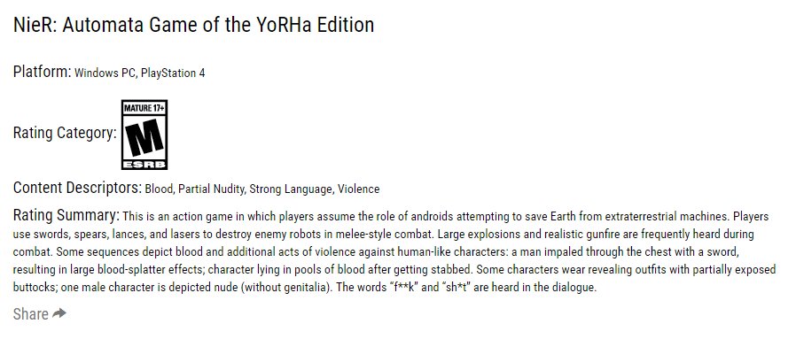 Bár a Square Enix egyelőre még nem jelentette be hivatalosan, a korbesorolásért felelős ESRB jóvoltából azonban idő előtt kicsúszott, hogy GOTY kiadás készülhet a NieR: Automatához. Egyelőre semmiféle mellékes információt nem kaptunk a történtek mellé, csak annyit, hogy a csomag a NieR: Automata Game of the YoRHa Edition címet kapja a keresztségben, PC-re és PS4-re is megjelenik, az alapjáték mellett pedig bizonyára az összes későbbi DLC-t is tartalmazza majd.