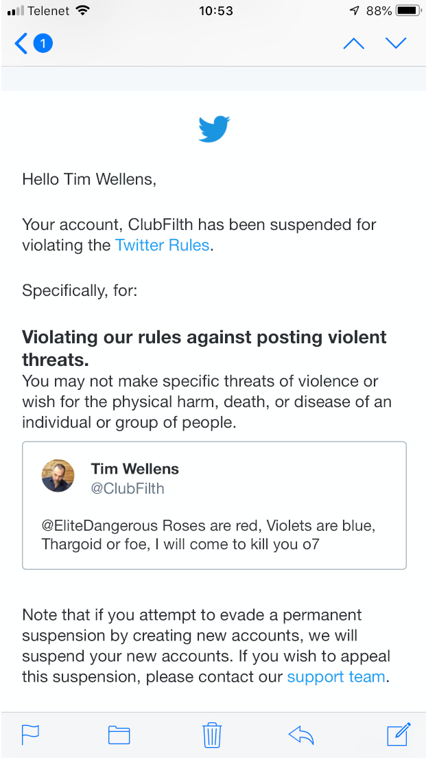 Természetesen jöttek válaszként a frappáns versikék, azonban volt egy, ami kiemelkedik az összes közül. Egy Tim Wellens nevű felhasználó ugyanis egy hangyányit félreérthető tweetben reagált a fejlesztőknek, amiért kitiltást kapott a Twitter által „erőszakos fenyegetés” címszóval.
