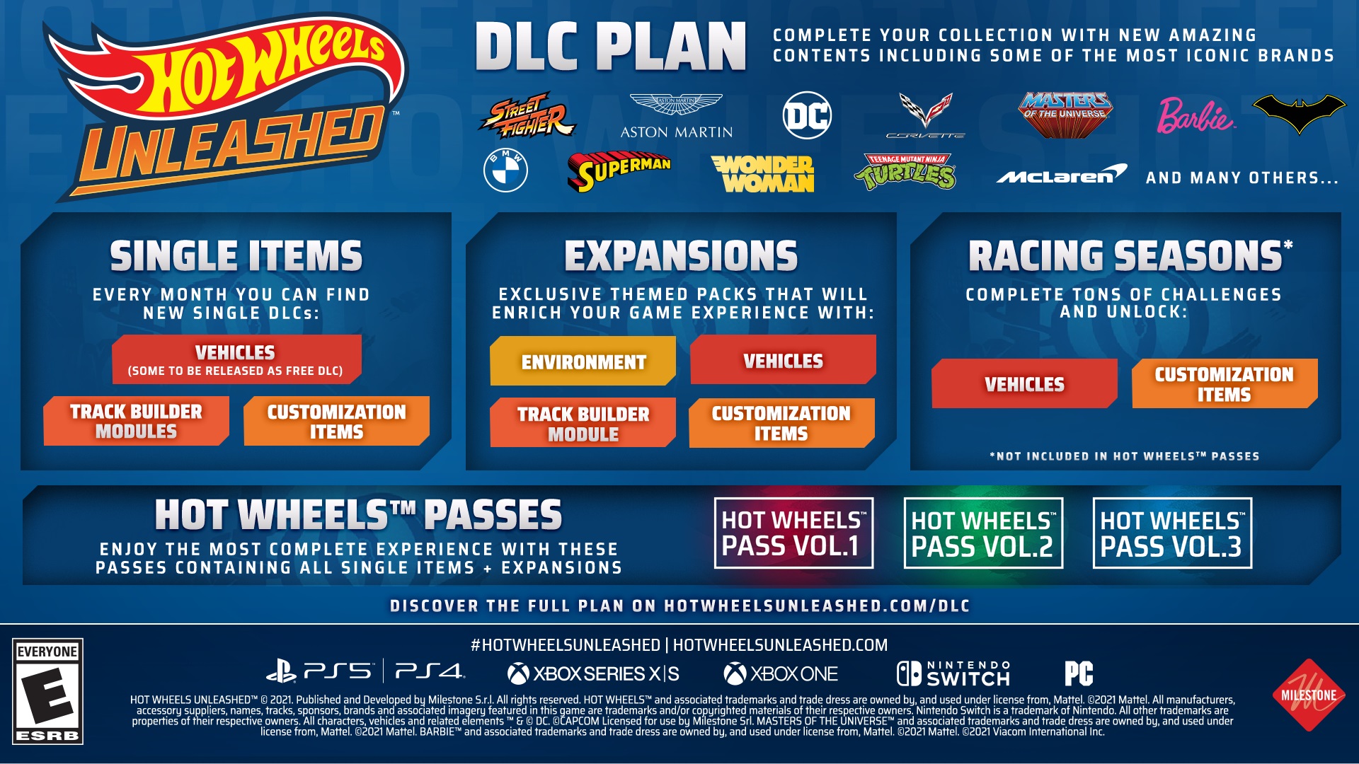 Azzal, hogy a Hot Wheels Unleashed megjelenik szeptember 30-án, még távolról sincs vége a dalnak, ugyanis a tartalom-cunami csak ezután robban be - felvázolta most a Milestone, hogy milyen jellegű kontentekre számíthatunk. Minden hónapban érkezni fognak új autók (egy részük ingyenes formában), a Track Buildern néven ismert pályaszerkesztőbe új elemeket integrálnak, valamint a testre szabhatóságot is tágítják. Emellett exkluzív tematikus pakkokkal is kibővítik az alkotást, arról meg már nem is beszélve, hogy folyamatosan jönnek a versenyszezonok is.