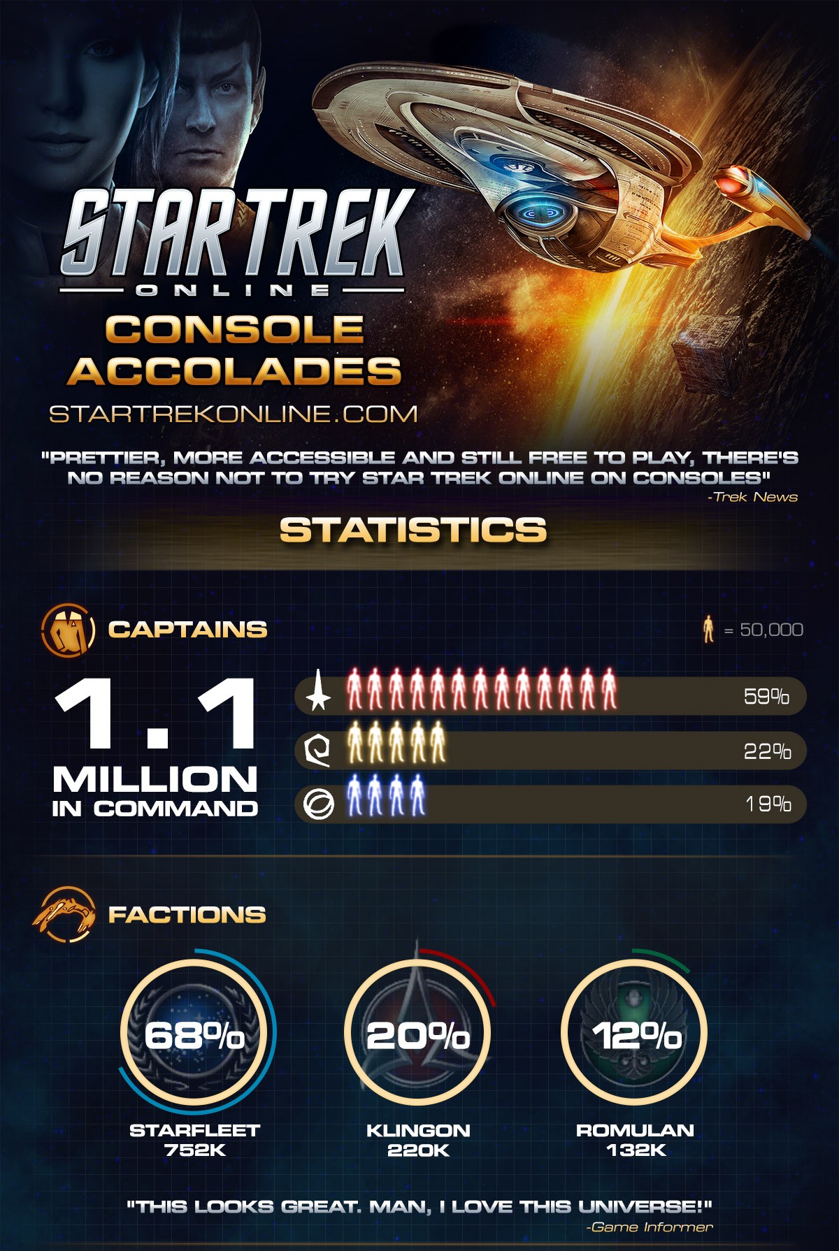 Ennek megfelelően a készítők egy infógrafikát is készítettek nekünk, amiből kiderült többek között, hogy az emberek jelentős része, közel 70 százalékuk a Starfleet frakció mellett indította kalandját, és míg 20 százalékuk a Klingonokat választotta, a Romulanok csak a jelenlegi réteg 12 százalékát teszik ki.