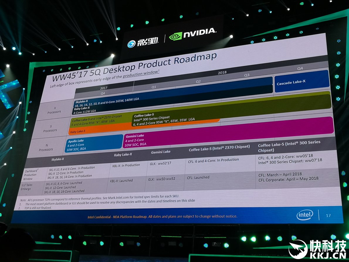 A kép alapján ráadásul 2018 elején az Intel a Coffe Lake-S termékcsaládot is megújítja egy kicsikét, ezáltal érkezhetnek az első Intel 300-as lapkakészletekre alapozó CPU-k, azonban a nagy durranás azért határozottan az év végén történik majd, a csúcskategóriás Cascade Lake-X processzorokkal.