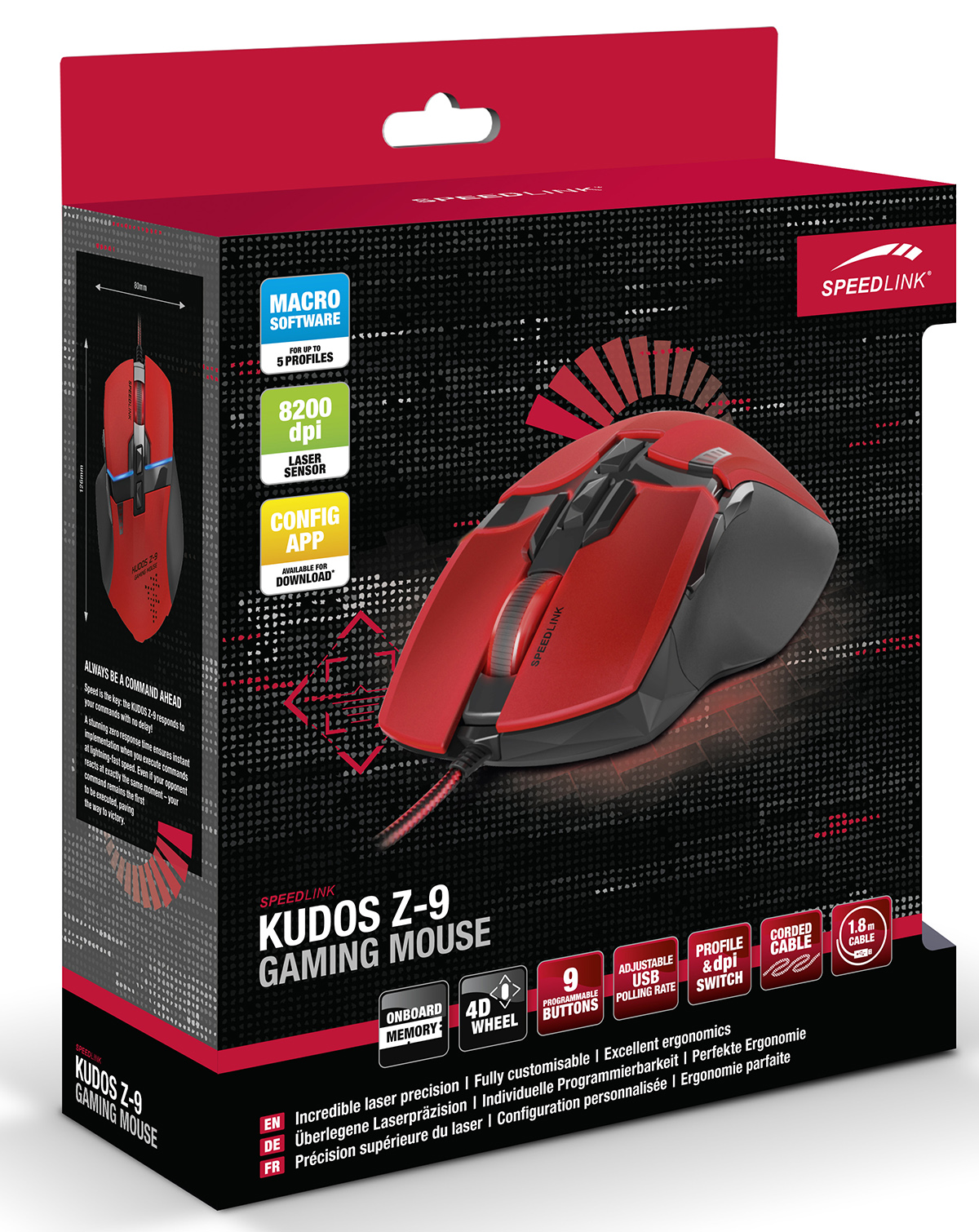 A 8200dpi érzékenységű szenzorral és vörös színnel érkező német gamer egér minden gombját saját ízlésünk szerint állíthatjuk be, ebben pedig okostelefonos segédprogram is segít nekünk, így nem kell kilépni a játékból ahhoz, hogy gyorsan átállítsunk valamit.
