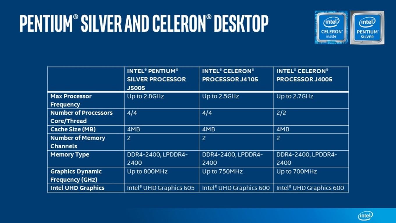 Az asztali sorozat közül a legjobb teljesítményt az Intel Pentium Silver J5005 garantálja majd, mely egy négymagos, 1,5 GHz-es (boost mellett 2,8 GHz-es) lapka lett, alternatívája pedig az Intel Celeron J4105, mely négy maggal és ugyanúgy 1,5 GHz-es órajellel bír, de boost mellett csak 2,5 GHz-et préselhetünk ki belőle. Mellettük érkezik még egy kétmagos modell is, az Intel Celeron J4005, ami alsó hangon 2GHz-en ketyeg, de egy kis turbózás mellett akár 2,7 GHz-ig is húzható.