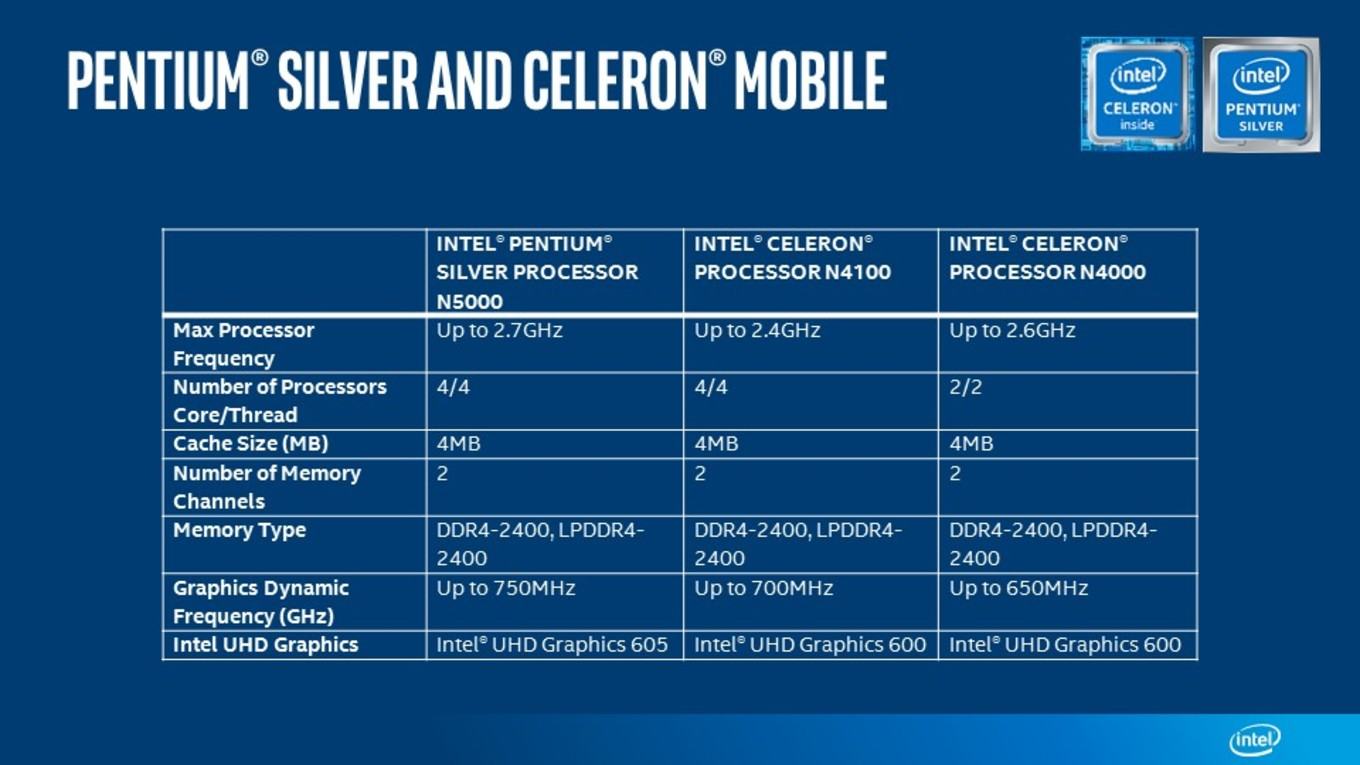 A hordozható rendszerekbe szánt Intel Gemini Lake processzorok közül a legerősebb a négymagos Intel Pentium Silver N5000 lesz, amely alaphangon 1,1 GHz-en ketyeg majd, de boost mellett 2,7 GHz-re lesz képes. Alternatívája az Intel Celeron N4100-as lesz 1,1 GHz és 2,4 GHz párosítással, amiből készül egy kétmagos verzió is Intel Celeron N4000 név alatt 1,1 GHz-es alap-, és 2,6 GHz-es boostolt órajellel.