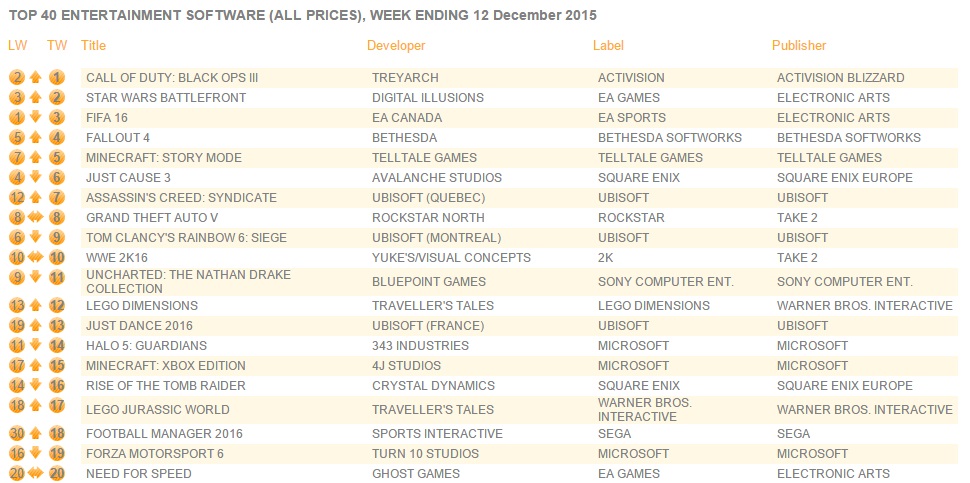 Közeleg a karácsony, ennek megfelelően a britek eladási listáin kezd helyreállni a rend, vagyis mintha nem is jelent volna meg más játék a közelmúltban, szinte a szokásos nagy címek állnak a dobogón. Hogy mikor lesz már változás? Erre a kérdésre egyelőre nem tudunk válaszolni nektek, ellenben egyelőre nem úgy tűnik, hogy a közeljövőben, amit mi sem bizonyít jobban más, minthogy a britek múlt heti játékeladási listáján a Call of Duty: Black Ops 3 vitte a prímet, és bár a második helyen a Star Wars: Battlefront volt, a dobogó harmadik fokán már ismét a FIFA 16 ostromol.