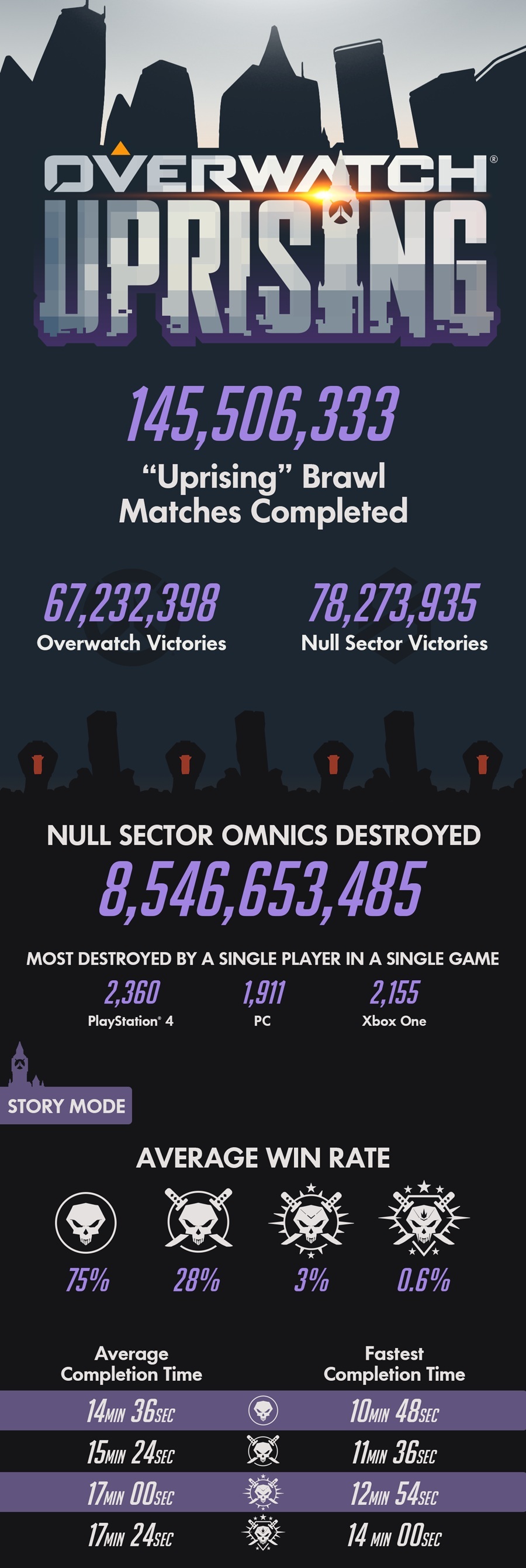 A Blizzard egy egészen elképesztő infógrafikát mutatott be a már több mint 30 milliós játékosbázissal rendelkező Overwatch legutóbbi eventje kapcsán, amely Uprising név alatt zajlott le, és az alkotáshoz hasonlóan elképesztő sikert aratott. Kiderült például, hogy az esemény során a rajongók több mint 145 millió mérkőzést játszottak le, amiből 67 milliószor az Overwatch, 78 milliószor pedig a Null Sector győzedelmeskedett, miközben a játékosok több mint 800 millió loot csomagra tették rá a kezüket.