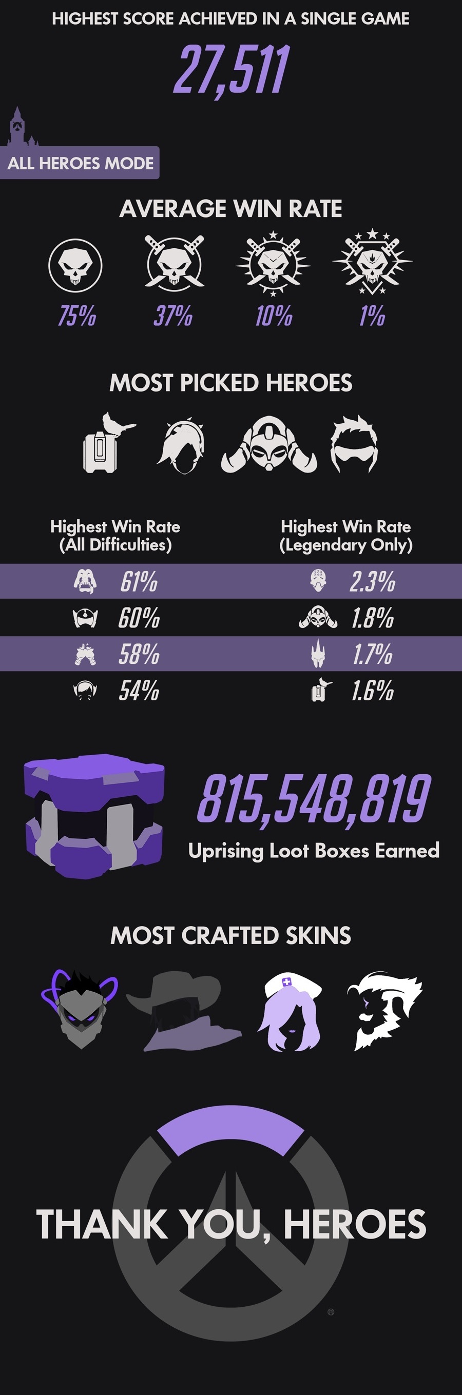 Mindez persze csak a jéghegy csúcsa, így ha kíváncsi vagy arra, hogy kik voltak a legnépszerűbb hősök, a legjobb eredmények és egyebek, akkor böngészd át az alábbi statisztikákat, melyekből mindent megtudhatsz az Overwatch: Uprising eventjéről.