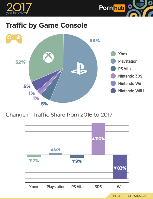 Igencsak különleges infógrafikával lepett meg minket ma délután a Pornhub, akik összeszámolták és diagrammal ábrázolták, hogy felhasználóik melyik konzolról nézték a legtöbb pornót a tavalyi esztendőben. Az abszolút nyertes a PlayStation volt - avagy a PS3 és a PS4 -, lévén az összes játékkonzolról megtekintett pornónak az 56 százalékát a platform kedvelői szolgáltatták, míg a második helyen az Xbox 360-as és Xbox One-os tábor található, akik az összes szexuális tartalom megtekintésének 32 százalékáért tehetők felelőssé, ami egyébként 6 százalékos csökkenés 2016-hoz mérten.