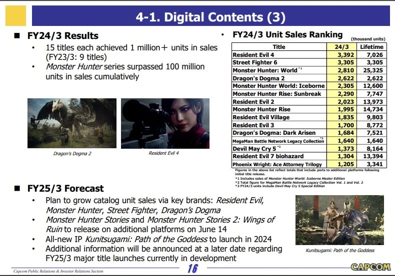A júniusban debütált Street Fighter 6 3,3 millió példányban kelt el, míg a legújabb nagy cím, a Dragon’s Dogma 2 a megjelenés óta 2,6 millió példányban fogyott, ezzel a franchise teljes eladása 11 millió fölé emelkedett. A Monster Hunter franchise is jól teljesített ebben a pénzügyi időszakban, amelyben összesen 15 cím ért el 1 millió feletti eladást.