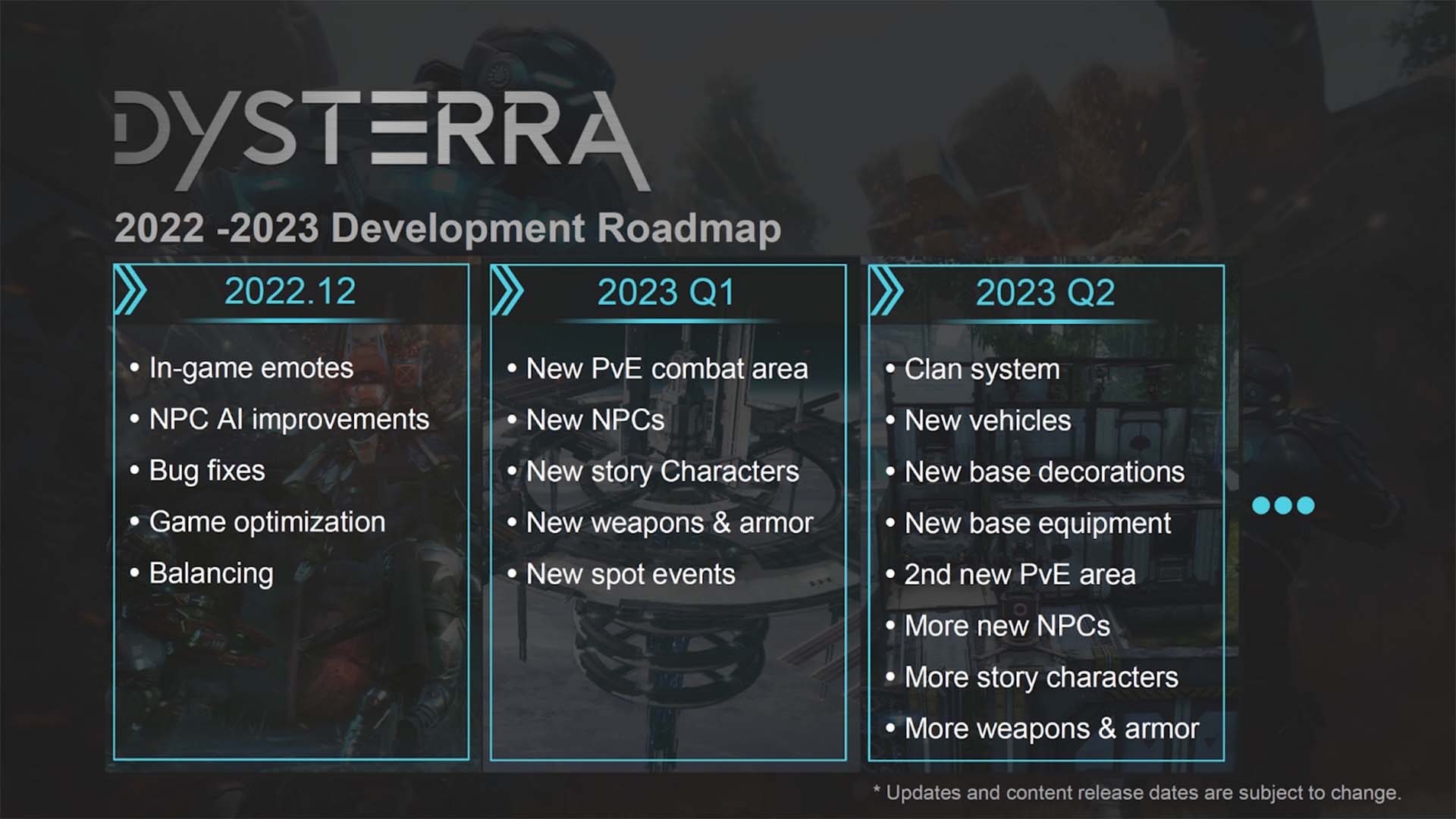 A sci-fi túlélős lövölde, a Dysterra 2023-ra is tartogat meglepetéseket a játékosok számára, idén többek között új fegyverek, kioldható páncélok, sztoriküldetések, vadiúj járművek, valamint új PvE területek is érkeznek majd a lövöldözős programba. A Dysterra idén is számos újdonsággal várja a játékosokat, ugyanis a Reality MagiQ közzétette a 2023-as roadmap-et. A különféle hibajavítások mellett jut idő friss tartalmakra is, 2023 első negyedévében egy új PvE terület, vadiúj fegyverek, páncélok, új NPC-karakterek, valamint számos event és sztoriküldetés is vár majd ránk. A bázisunkat szabadon kidekorálhatjuk majd, 2023 második negyedévében pedig további újdonságokra számíthatunk.