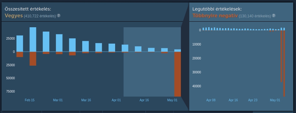 A reakció katasztrofális eredményt hozott, van, aki visszatérítést kér, a játék Steam oldalát pedig egy hatalmas csapás érte. A héten „többnyire pozitív” értékelés volt olvasható, a bejelentkezési ügy óta azonban már „vegyes”, az elmúlt 30 nap pedig „többnyire negatívat” jelez.