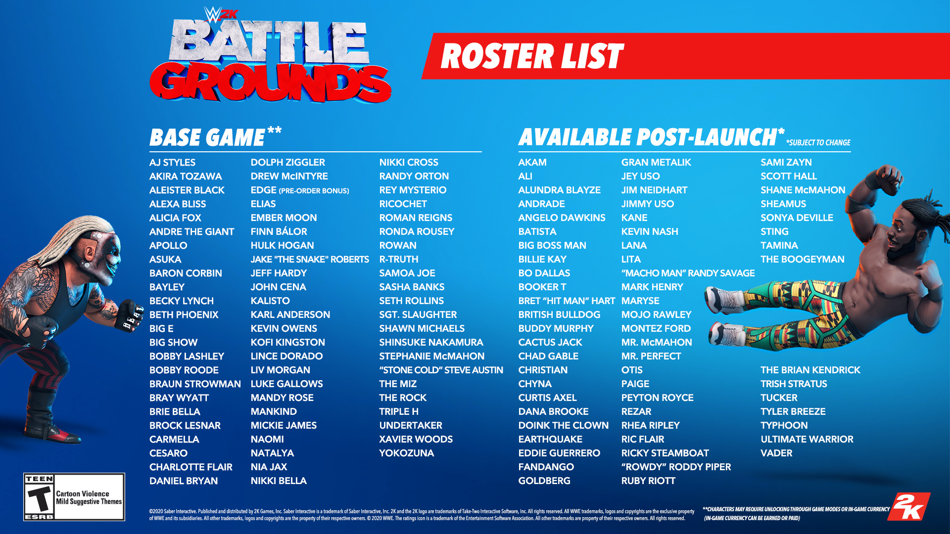 Manapság a verekedős játékok igazi kánaánnak bizonyulnak a kiadók számára, lévén DLC-falak mögé tudják rejteni azokat a bunyósokat, akik akár már a megjelenéskor is debütálhatnának, de biztos, ami biztos, elkérik értük a pénzt. Bár a WWE 2K Battlegrounds esetében is jönni fog bőven új karakter, de az alapjátéknak sem kell szégyenkeznie, lévén több mint 70 pankrátorral indul útjának, köztük gyakorlatilag minden nagyobb névvel. A premier után főként a legendákat pakolják bele az alkotásba, avagy azon pankrátorokat, akik már nem űzik az ipart.