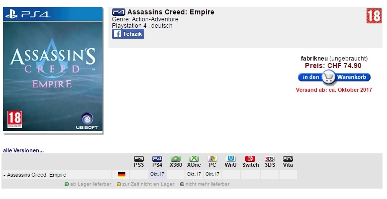 Egyre valószínűbb, hogy a korábbi pletykáknak megfelelően Assassin's Creed Empire címmel érkezhet majd a Ubisoft népszerű sorozatának következő, idei őszre várt új epizódja, melyet a hétvégén több internetes áruház is listázott. A Redditen írottak szerint egyszerre három, egymástól független internetes bolt is kínálatába tette az Assassin's Creed Empire-t, így többek között a WoG és a CDON, valamint az Alcom adatbázisában is felbukkant a játék, melyek bár egymástól eltérő dátumokkal szolgáltak, ellenben mindegyik őszre lőtte be az új rész érkezését, így október 17. és november 30. közé.