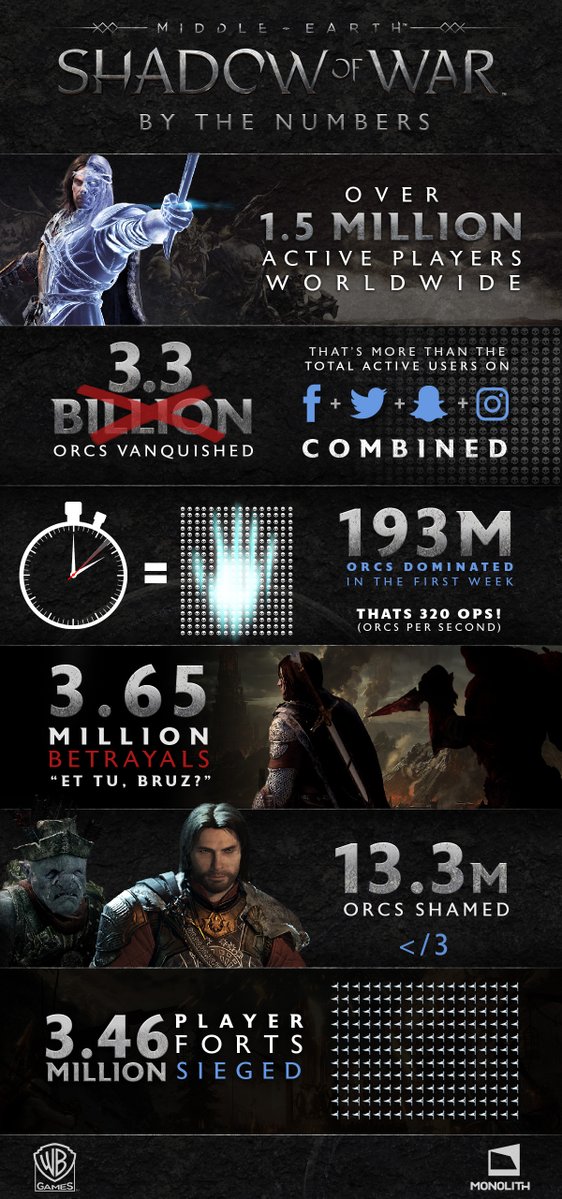 Hogy még teljesebb legyen az összkép, a Monolith Productions közölte az első statisztikákat a Middle-Earth: Shadow of War első eredményeiről. Lentebb mindent megtaláltok: