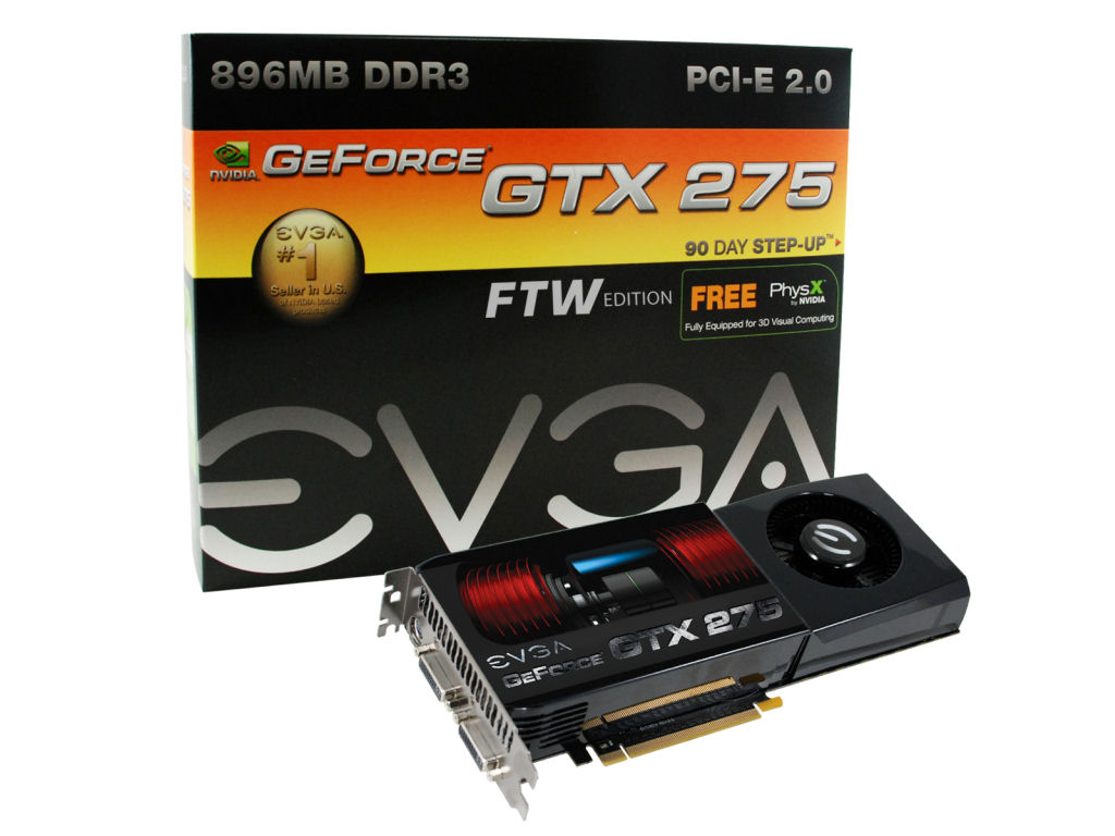 A legújabb EVGA grafikus kártya hűtéséről, az nVidia két kártyahelyet elfoglaló referencia hűtőrendszere gondoskodik. Az EVGA Geforce GTX 275 FTW grafikus feldolgozójának sebességét 713MHz-re, míg a 240 shader processzorét 1512MHz-re emelték. Az 512bit-es GDDR3 memóriarendszer 141,52GB/s-os sávszélességgel rendelkezik, és 896MB RAM-al van ellátva, amit 2520MHz-es effektív teljesítményre hangoltak. A videokártya hátulján két DVI-I és egy HDTV-7 kimenet kapott helyet, de a nyomtatott áramkörön természetesen megtalálható az SLI csatolófelület is, így lehetőségünk van a három utas SLI konfiguráció kiépítésére. Az EVGA GeForce GTX 275 FTW egyelőre még csak a gyártó honlapján rendelhető meg 299$-os áron.