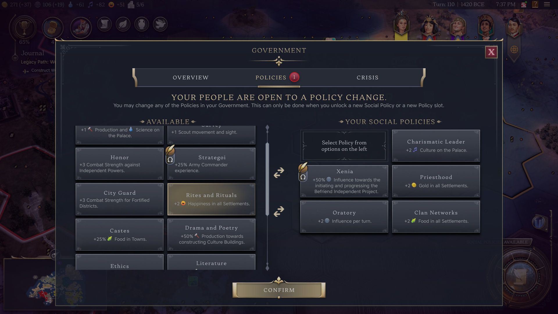 Végső soron érthető ez a tiszta lappal indulás. Így nem fognak hosszabb távra beragadni városállamok a játékosoknál, illetve lesz esélyük a gyengébb társadalmaknak is előbújni és visszavágni az őket terrorizáló erősebb népnek. Mondjuk azt nem értettem, hogy a vallást miért kellett ugyanúgy eltörölni az alapító városok kivételével mindenhonnan, főleg úgy, hogy a eklézsiák harca egyébként is tessék-lássék módon van implementálva. Csupán térítők útján terjednek a különböző hitek, egy városban maximum kettő vallás lehet jelen, és nincs egy külön pontmennyiség sem, ami költőeszközként érdekessé tehetné a vallással való taktikázást.