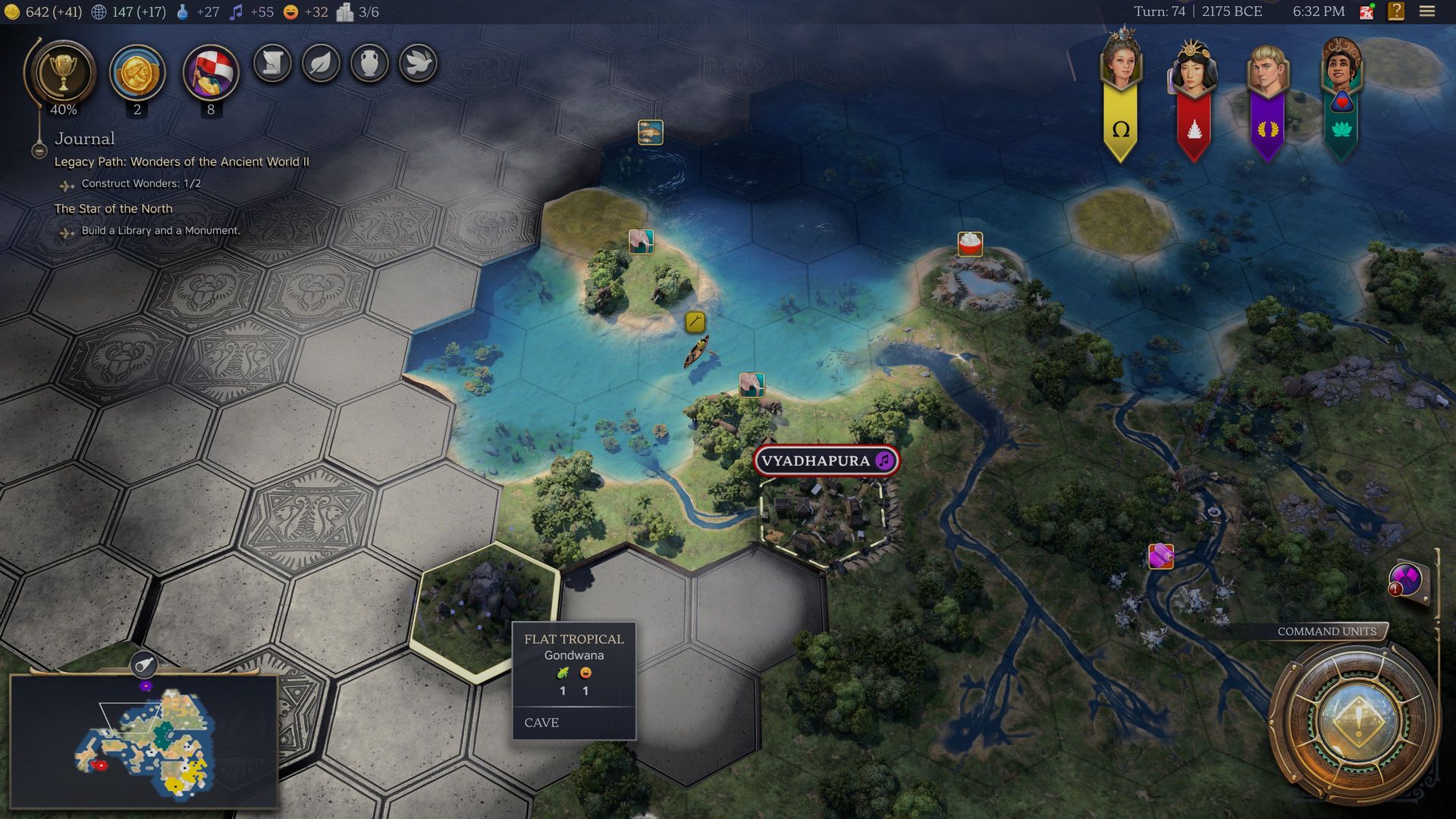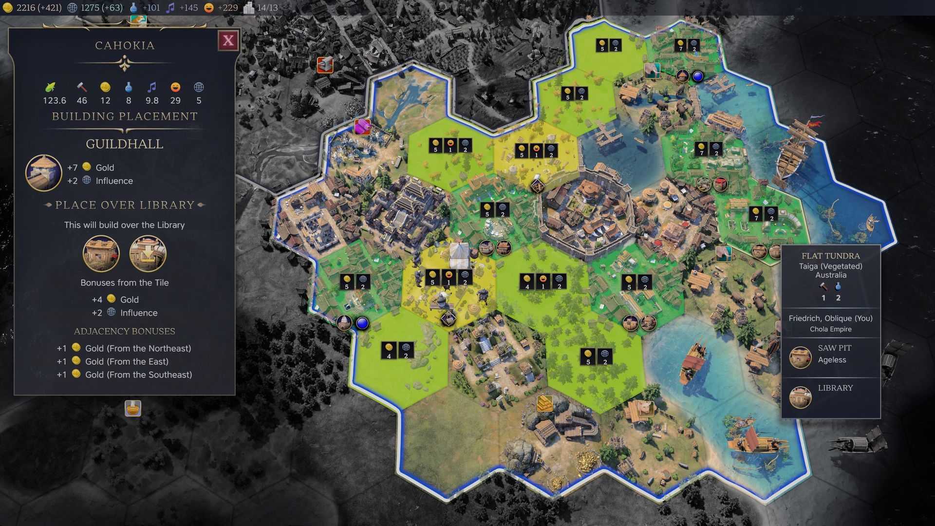 Minden egyes alkalommal, mikor nő a városunk, ki kell választanunk egy megművelt mezőt. Ilyenkor nemcsak elfoglalják embereink azt, hanem a körülötte lévő mezőkre is kiterjed a városunk határa (culture bomb, aki ismeri eme terminológiát a Civ VI-ból). Így lehet területre szert tenni, és többé nem kell technológiákat kikutatni ahhoz, hogy bizonyos nyersanyagokra rátelepedhessünk. A tech-ek most a legtöbb esetben egységeket, épületeket, csodákat, diplomáciai akciókat és törvényeket nyitnak meg.