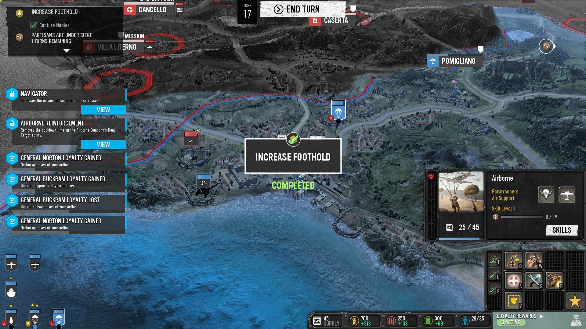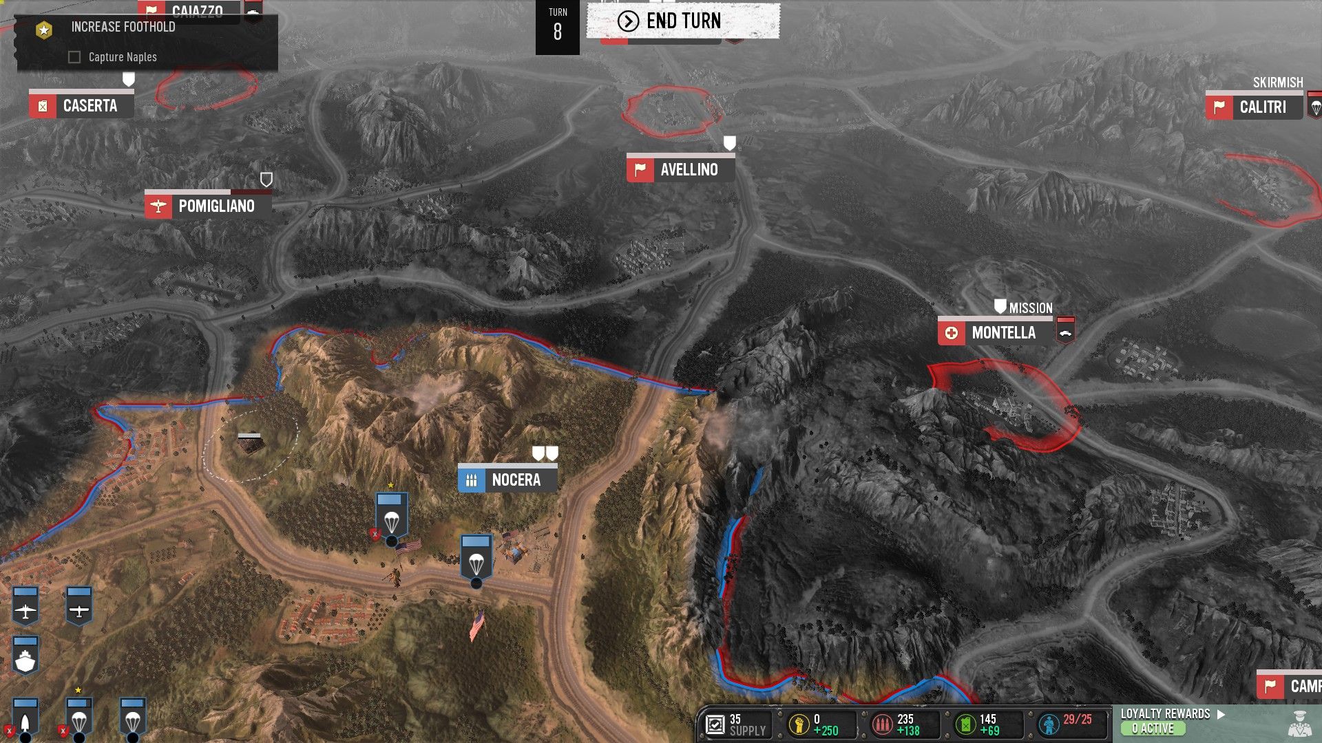 Az olasz invázió sztorivonal már egy fokkal érdekesebbnek fest, ugyanis itt a készítők megpróbálták implementálni a Total War-ból ismerős térképrendszert. Vagyis látjuk Itáliát a maga pompájában… legalábbis a fontosabb részeket, és nagyjából szabadon bejárhatjuk azt az alakulatainkkal. A terület, ahol épp egységeink állnak adhat nekik különféle bónuszokat, vagy hátrányokat, a harcokat pedig néhány esetben automatikusan is lezavarhatjuk, bár a gép hajlamos az ellenfél erejét túlértékelni, így a manuális lejátszása az ütközeteknek szinte mindig célravezetőbb, ha nem egyértelmű, ki nyerne első ránézésre.