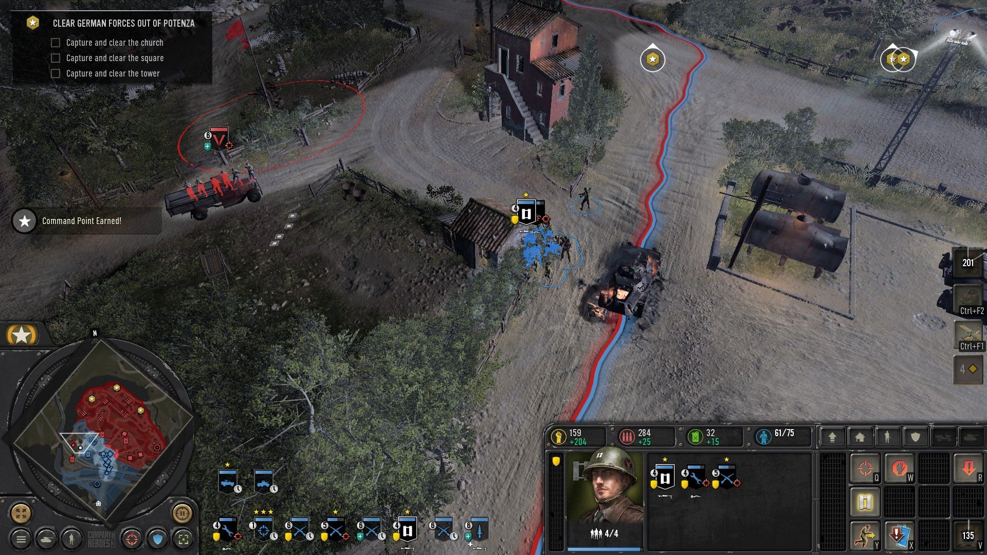 A multis, vagy „skirmish”-elős módokba nagyon nem mennék bele, ugyanis semmi igazán nagy újdonságot nem fogunk ilyen téren tapasztalni, ami különb lenne a szóló játékos mechanikáktól. Emberi erő, muníció, üzemanyag, bázisfoglalás és pontgyűjtögetés vár ránk. A játék során folyamatosan gyűlik a tapasztalati pont, melyekért „Command Point”-ok járnak. Ezek költögetésével hozzácsaphatunk embereinkhez bónuszokat az ismerős doktrínarendszer segítségével (páncélos, gyalogos, légitámogatás). Eddig minden tiszta.