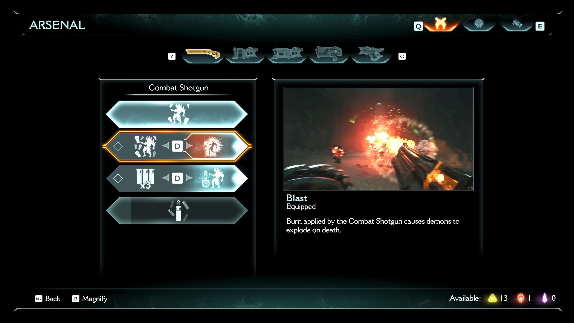 A fegyverek hat csoportba vannak felosztva. A BFC nem tartozik ide, azt külön gombbal kell kiválasztani, ráadásul a pajzs ilyenkor nem elérhető, tehát nincs rajta a fegyverválasztó „quicktab”-on, továbbá a közelharci arzenálunkból mindig csak egy lehet kiválasztva. Úgy oldották meg a készítők a kényelmes fegyverváltogatást, hogy kettesével szedték a legtöbb mordályt (nem véletlenül említettem fent őket párosával), tölténytípus szerint. Az „f”-el lehet az épp kezünkben lévő puffogtatót lecserélni a párjára, és itt jelenhet meg a legújabb Doom egyik gyenge pontja: nem lesz feltétlenül mindegyik fegyverre szükségünk.