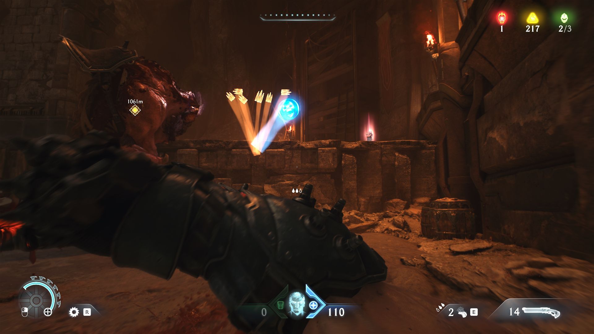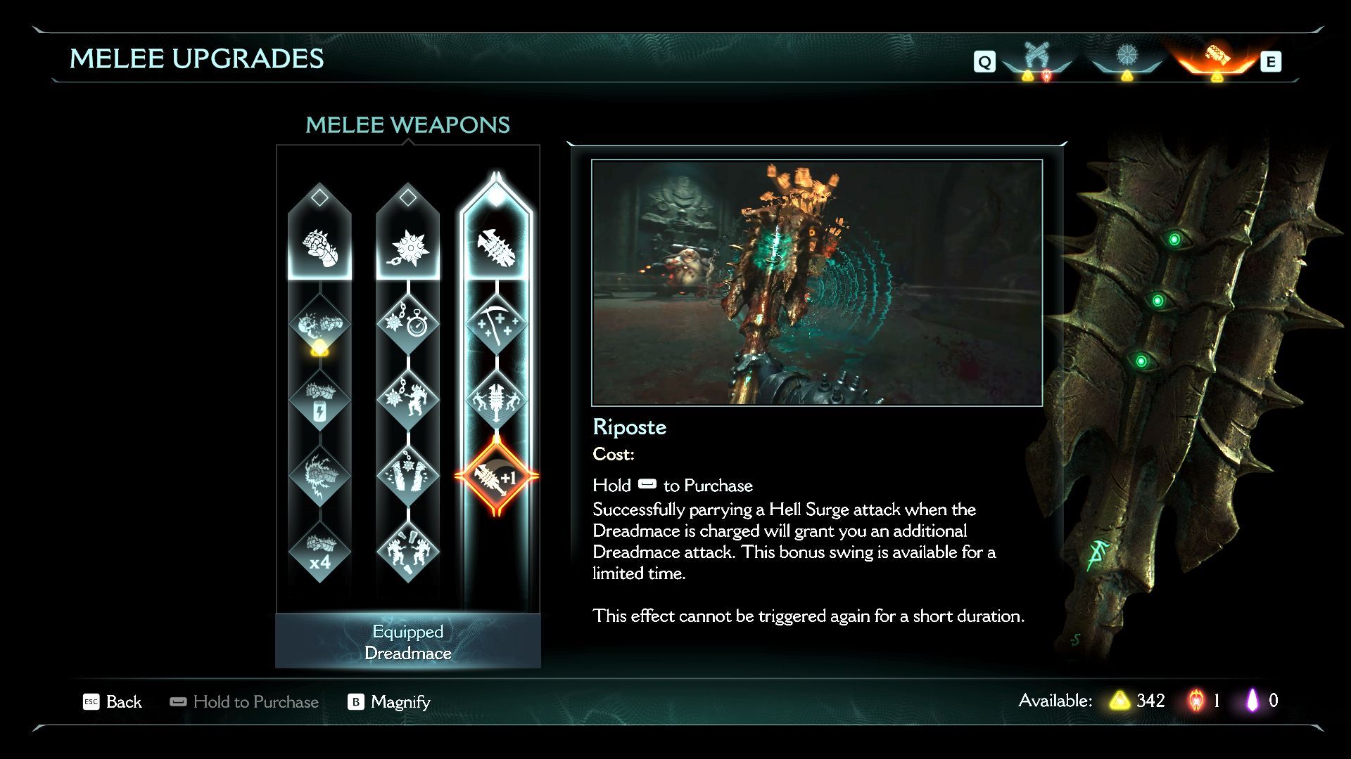 Aki pedig itt töltényt szeretne spórolni a fegyverváltogatással az eltévesztette a játékot. Itt mindig lesz elég skulónk, ha eleget használjuk a kivégző mozdulatokat, illetve a közelharci fegyverünket. Nekem a Dreadmace-re (jogar-buzogány) esett a választásom, miután megkaptam, mert hiába lehet ritkán használni, szeretem látni, ahogyan egy ütésre kipukkannak körülöttem még a legerősebb ellenfelek is.