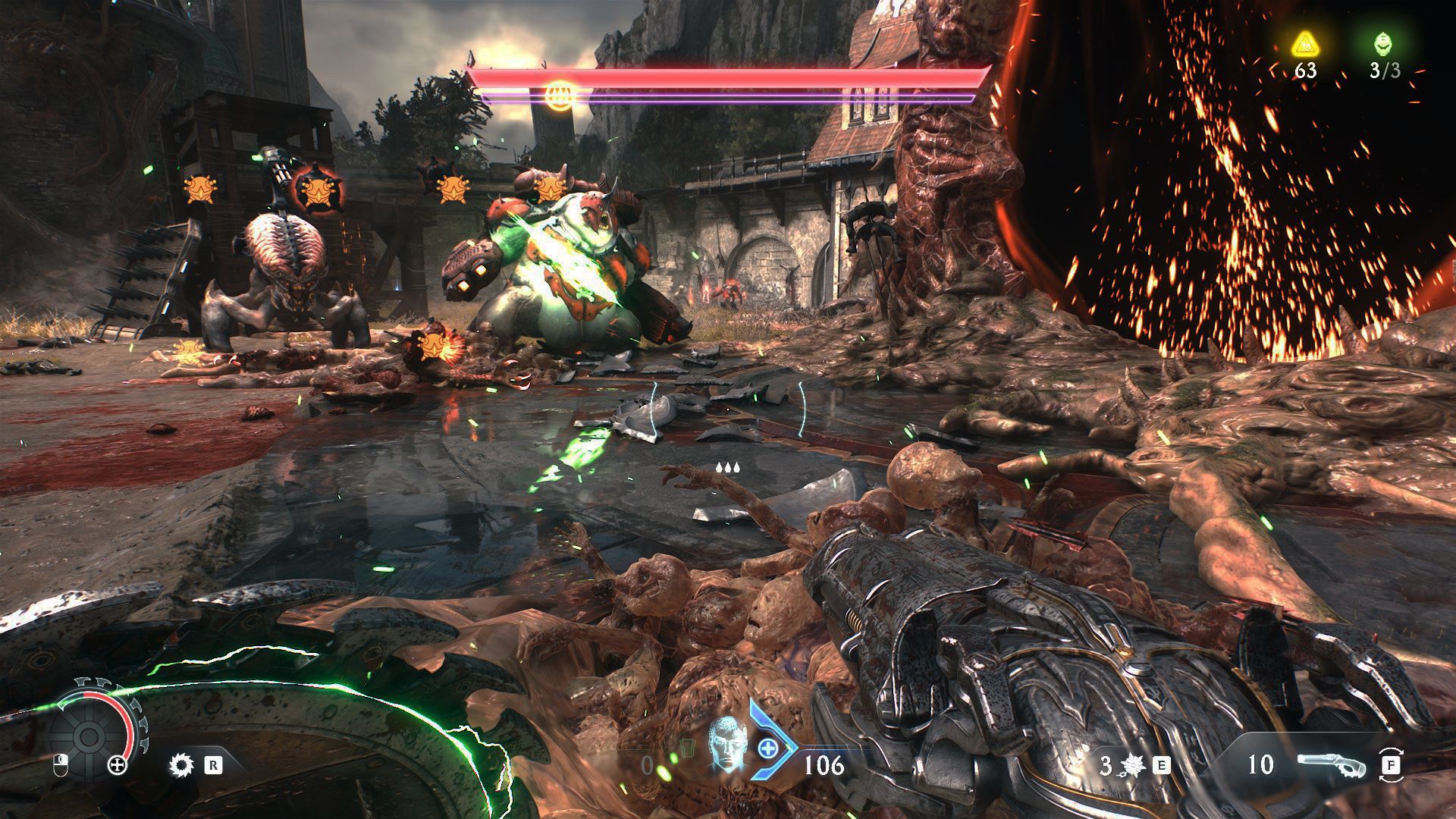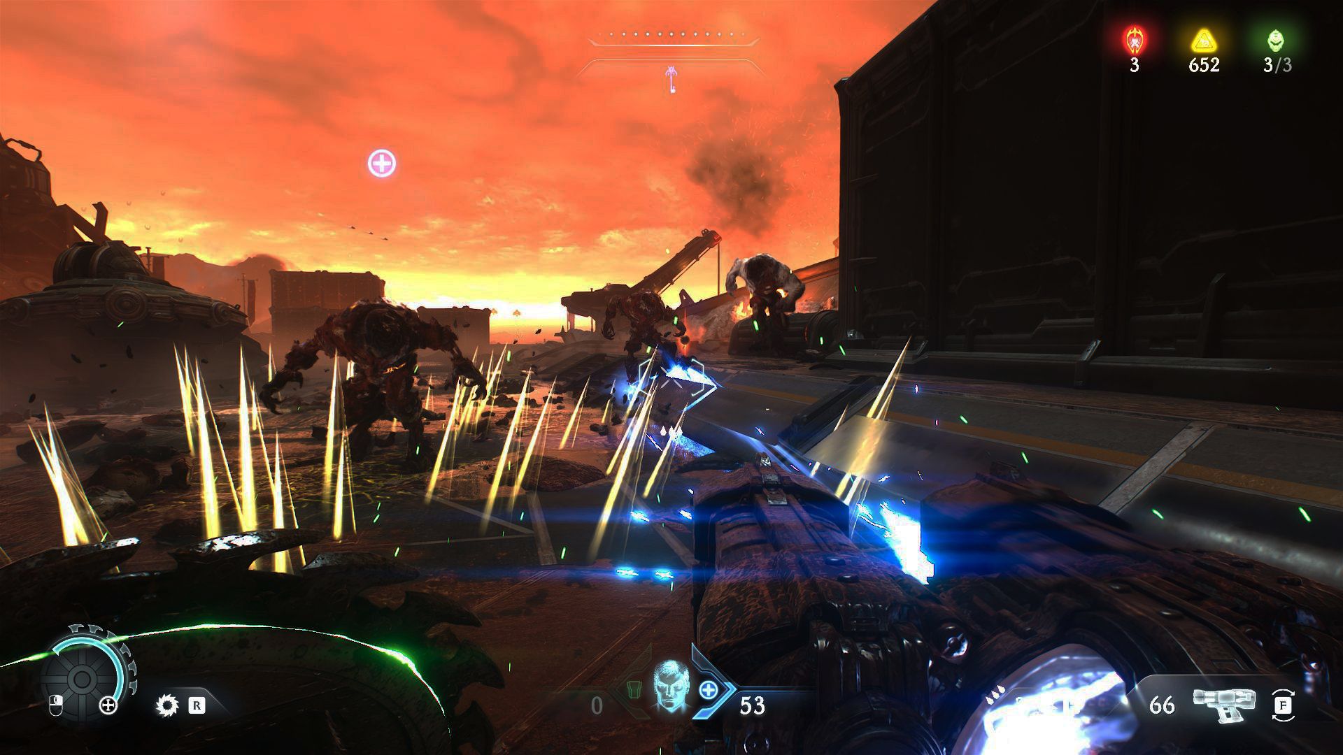 Ezeken kívül kapunk még egy Chainshot buzogánylövőt, mely igencsak hatékony a páncélos rosszaságok ellen, azonban kicsit trükkös vele a célzás, ráadásul csak egy célpont ellen hasznos. Illetve egy gránátvető is elérhetővé válik idővel, mely a rakétahányónak a párja, és pattogó robbanó töltetekkel teszi a démonok napját… szebbé. Végezetül pedig van a BFC, ami egy íjpuska, a jó öreg BFG-hez hasonló pusztítást okozó nyílvesszőkkel ellátva. Három töltényhelye van, és ritkásak hozzá a nyilak, de ha egyet ellövünk, akkor kő démonon nem marad.
